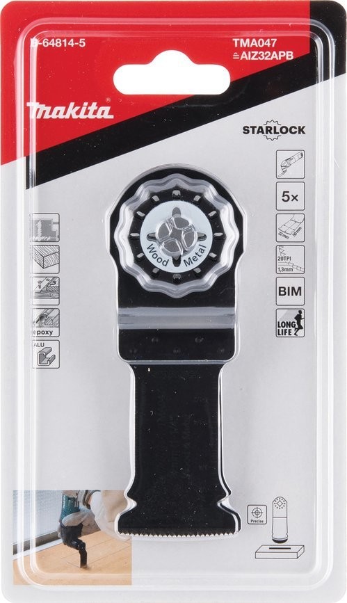 Makita-Sägeblatt für 32 mm, aus BIM-Material, ideal zum Schneiden von Holz. Die Packung enthält 5 Stück. Mit Starlock-Befestigungssystem für eine einfache und schnelle Befestigung an den Werkzeugen.