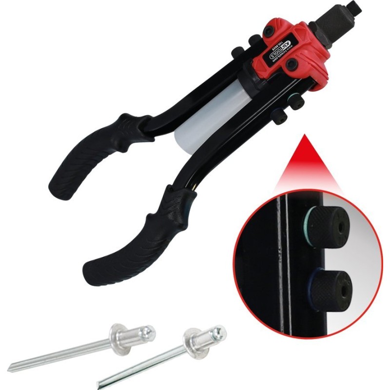 Die Nietmaschine verfügt über einen schmalen Kopf, der den Zugang zu schwer erreichbaren Stellen erleichtert. Sie verfügt außerdem über einen Nietbehälter, einen Gummigriff und ist aus hochwertigem Werkzeugstahl gefertigt.