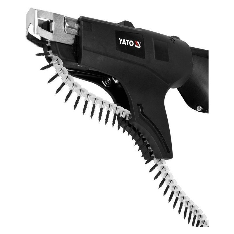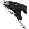 Schraubmaschine für die Arbeit mit Schraubmagazinen oder Einzelschrauben. Beschleunigt die Arbeit an Trockenbauwänden erheblich dank des Schraubbandzuführers und der hohen Drehzahl von bis zu 5500 U/min.