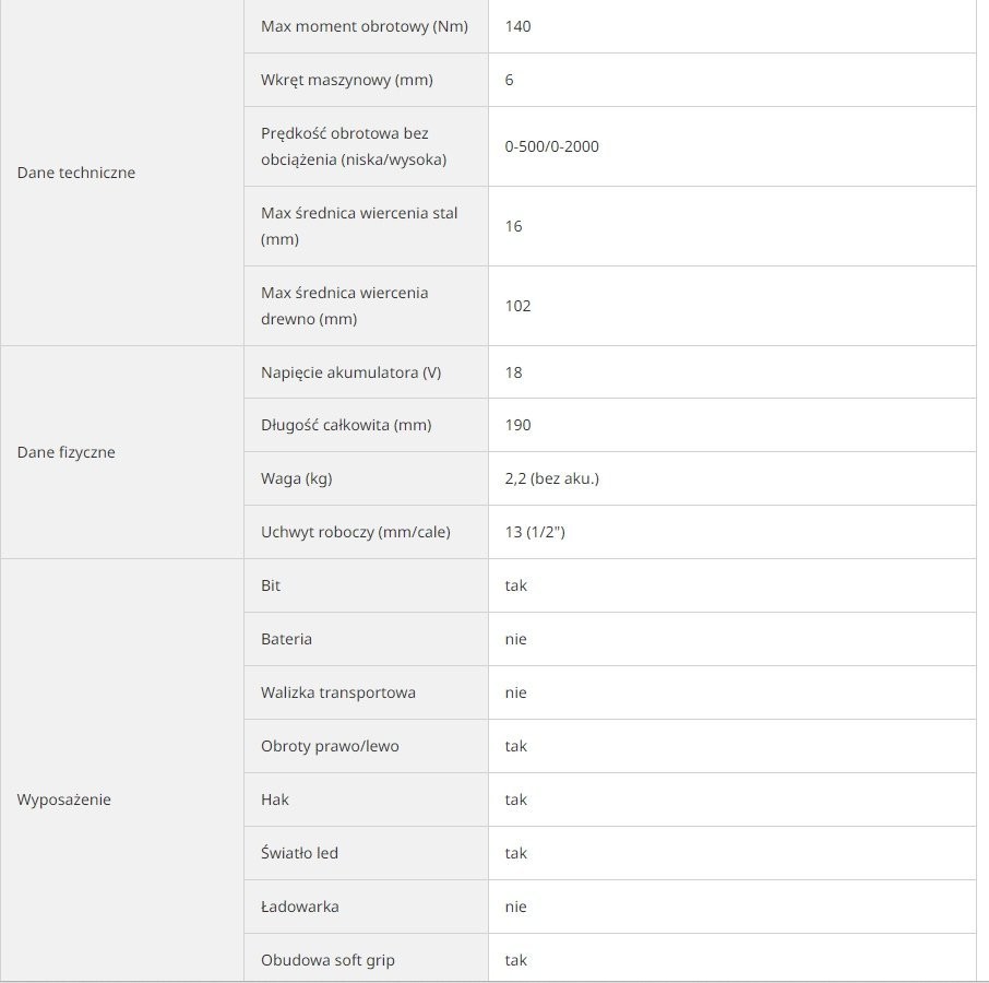 Sie ist ausgestattet mit: einem schlüssellosen Bohrfutter, einer automatischen Spindelarretierung, einer 22-stufigen Kupplung, einem weichen, rutschfesten Griff und einer LED-Beleuchtung