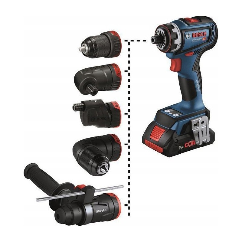 Das leistungsstarke Modell GSR 18V-90 FC Professional ist Teil des Bosch Professional FlexiClick-Systems, das den Anwender optimal auf alle anfallenden Aufgaben vorbereitet: Der austauschbare Randschraubaufsatz ermöglicht das Arbeiten an Kanten und Wänden, und der austauschbare Winkelaufsatz verwandelt den Bohrschrauber in eine Winkelbohrmaschine. Die austauschbaren Aufsätze lassen sich in 16 verschiedenen Positionen und in einem Winkel von bis zu 360° arretieren, ohne dass sie vom Werkzeug abgenommen werden müssen. Durch das Anbringen des einzigartigen SDS-Wechselhalters GFA 18-H verwandelt sich das Elektrowerkzeug in einen vollwertigen SDS-Plus-Bohrhammer, der für das einfache Schlagbohren von Löchern mit einem Durchmesser von bis zu 10 mm in Beton ausgelegt ist. Mit einer Gehäuselänge von nur 136 mm und einem maximalen Drehmoment von 64 Nm steht dem Anwender ein äußerst kompaktes und zugleich leistungsstarkes Elektrowerkzeug zur Verfügung. Das Bosch Professional FlexiClick-System – die perfekte Lösung für professionelle Anwendungen.
