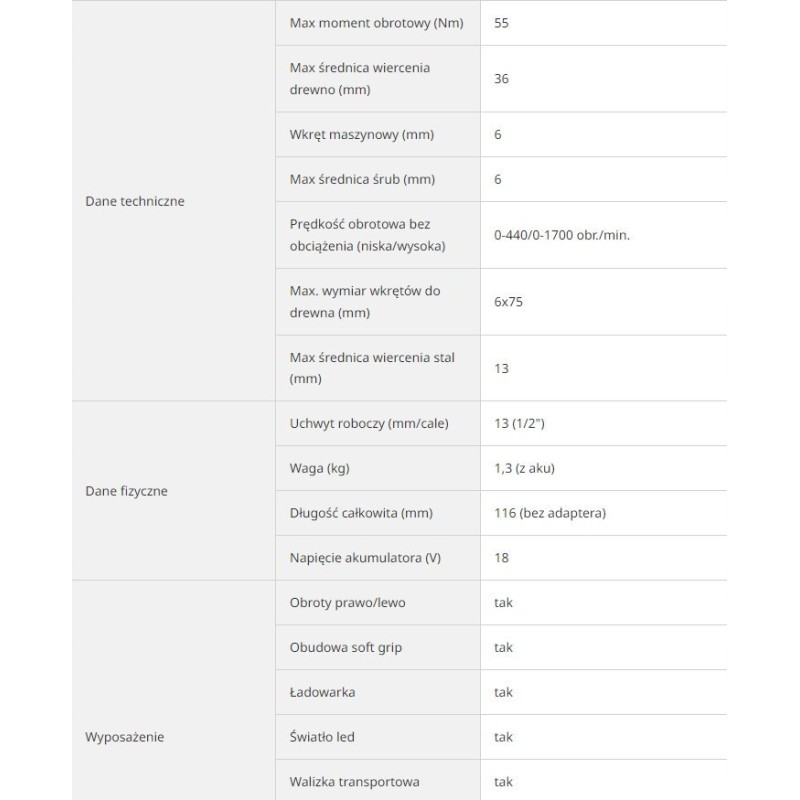 Die Leistungsfähigkeit unseres Geräts hängt hauptsächlich von der Kraft ab, mit der es Schrauben und andere Verbindungselemente lösen und festziehen kann. Je höher das maximale Drehmoment des Schraubenschlüssels ist, desto besser ist seine Leistung. Das Werkzeug bewältigt problemlos selbst sehr festsitzende oder festgefressene Schrauben. Das Drehmoment wird in Newtonmetern (Nm) gemessen.