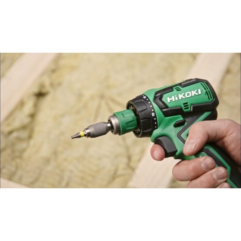 Der Bohrschrauber wird mit BSL1820-Akkus mit einer Kapazität von 2,0 Ah betrieben, was für hohe Mobilität und Bedienkomfort sorgt. Das Werkzeug ist mit allen Li-Ionen-Steckakkus der Marke Hikoki kompatibel, was einen einfachen Austausch und das Aufladen der Akkus ermöglicht.