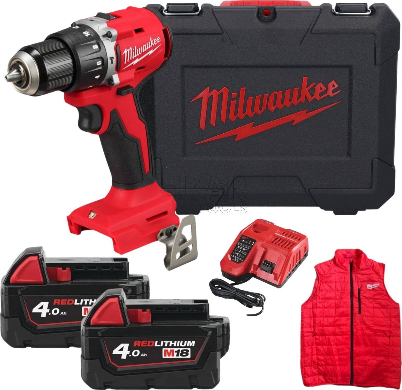 Im Set enthalten sind zwei M18 REDLITHIUM™-Akkus mit einer Kapazität von 4,0 Ah, die für lang anhaltende Leistung sorgen. Dank ihnen können Arbeiten ohne Ladeunterbrechungen durchgeführt werden, was die Effizienz und den Bedienkomfort erhöht.