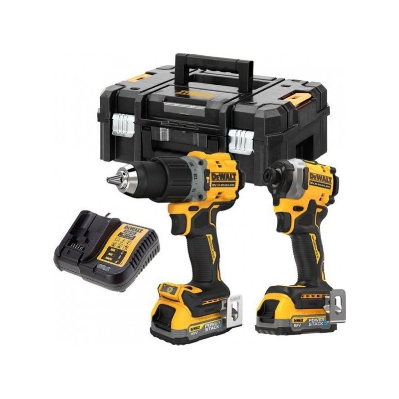 Technische Daten: DCD805: Motor: bürstenlos Stromversorgung: Akku Betriebsspannung: 18 V Länge: 177 mm Gänge: 2 Drehmoment: 90 Nm Leerlaufdrehzahl: 650/2000 U/min Schlagfrequenz: 34.000 Schläge/min Bohrleistung (Holz/Metall/Stein): 55 / 13 / 13 mm Gewicht: 1,3 kg DCF850: Motor: bürstenlos Stromversorgung: Akku Betriebsspannung: 18 V Drehmoment: 205 Nm Leerlaufdrehzahl: 3250 U/min Schlagfrequenz: 3800 Schläge/Minute Gewicht: 0,9 kg STANDARD-AUSSTATTUNG: 2x Powerstack-Akku 1,7 Ah Ladegerät Koffer TSTAK II **...