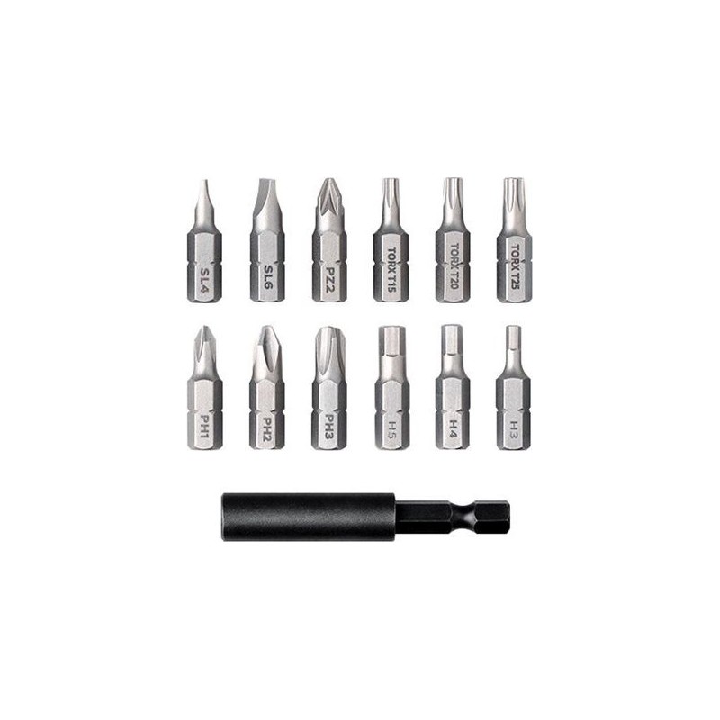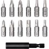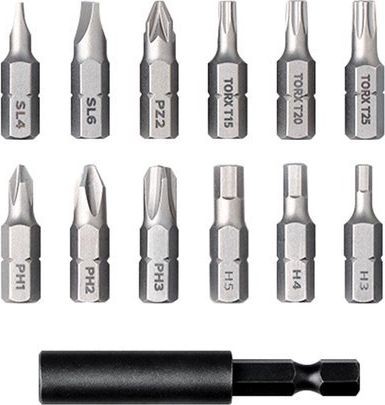 Mit dem hinteren Drehknopf können Sie schnell die Drehrichtung zum Eindrehen oder Herausdrehen der Schraube wechseln. Auch bei längerem Gebrauch rutscht das Gerät nicht in den Händen. Im Lieferumfang ist ein Satz von 12 Bits aus hochwertigem S2-Stahl enthalten. Eine zusätzliche Verlängerung ermöglicht den Zugang zu engen und schwer erreichbaren Stellen. Das gesamte Set ist in einem praktischen Etui verpackt, sodass Sie alle Teile an einem Ort haben.