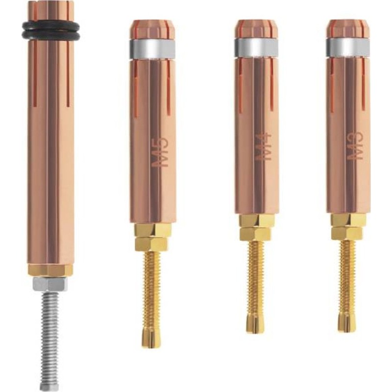 Für die Schweißmaschine von Stamos Germany sind Stifte der Größen M3, M4, M5, M6 und M8 (max. Länge 40 mm) geeignet . Diese werden mit einer Dreipin-Pistole angeschweißt. Im Lieferumfang sind Halterungen zum Festhalten der Stifte enthalten.