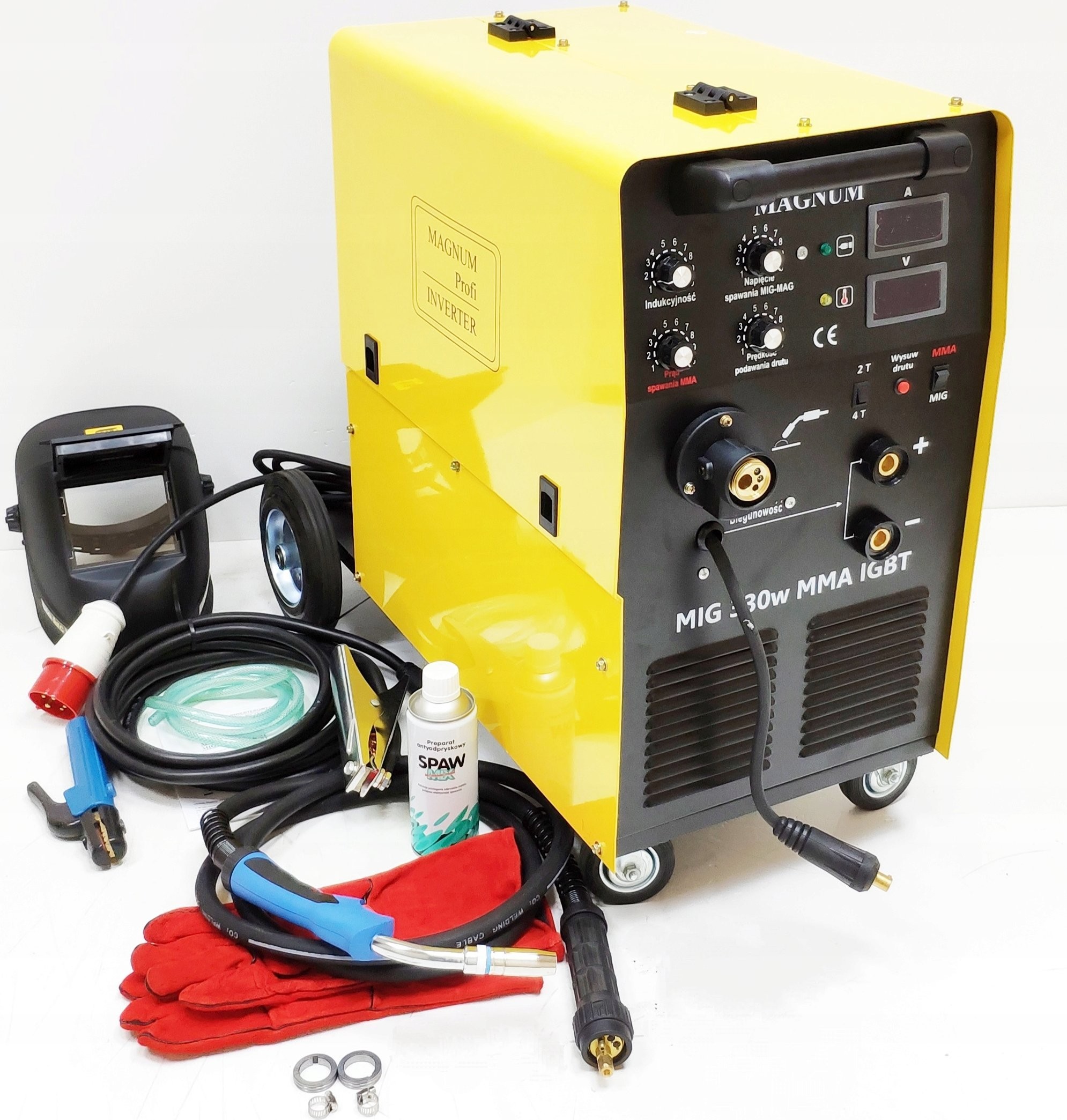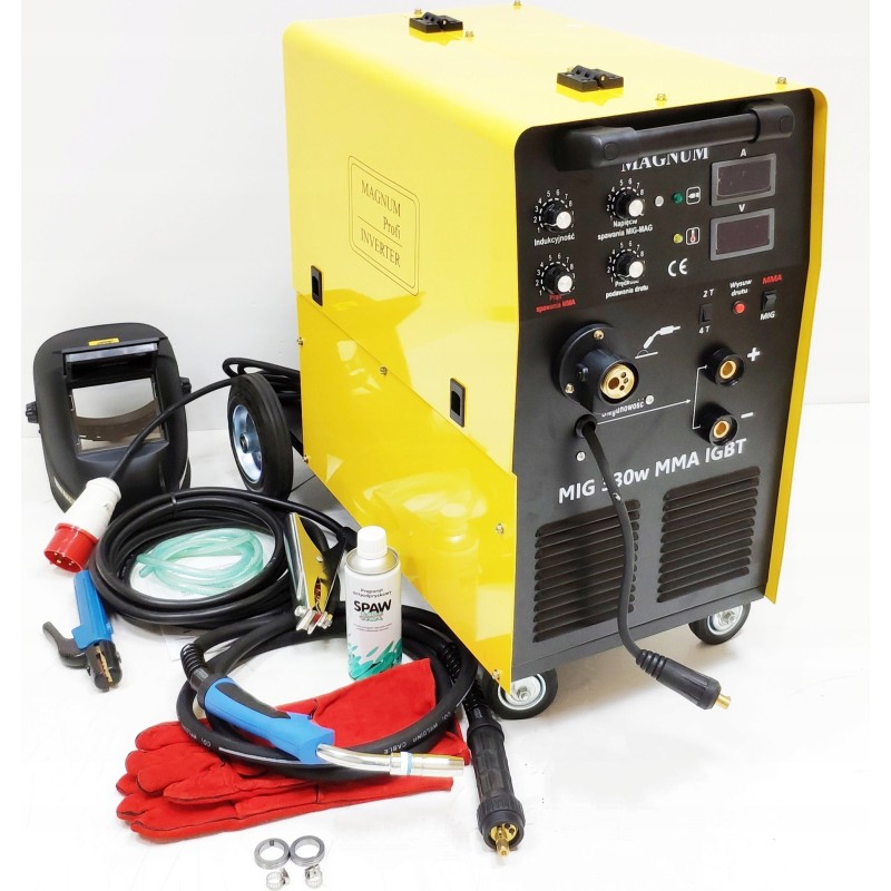 Hersteller: MAGNUM ║ Schweißverfahren: MIG/MAG, MMA, FLUX, LÖTSCHWEISSEN ║ Stromversorgung: 400 V ║ Schweißstrom: 330 A ║ Wirkungsgrad: 60 %