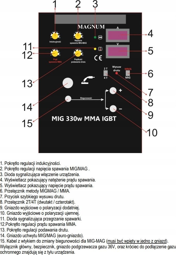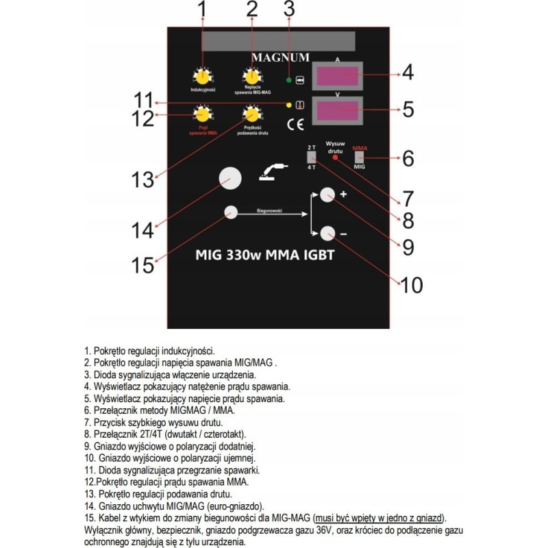 Das professionelle halbautomatische Schweißgerät MAGNUM MIG 330W ist für das Schweißen von kohlenstoffarmem, niedriglegiertem Stahl (MAG), legiertem Stahl (MIG) sowie Aluminium und dessen Legierungen vorgesehen. Das Gerät ermöglicht das Schweißen im MMA-Verfahren unter Verwendung von ummantelten Schweißstäben. Dank der variablen Polarität kann mit selbstschützenden Fülldrähten (FLUX) geschweißt werden. Die einstellbare Induktivität ermöglicht spritzerfreies Schweißen sowohl von dünnen Blechen als auch von dicken Profilen sowie die Durchführung des CuSi-Löt-Schweißverfahrens. Das Schweißen kann klassisch im 2T-Verfahren oder im 4T-Verfahren erfolgen, das bei längeren Schweißnähten angewendet wird.