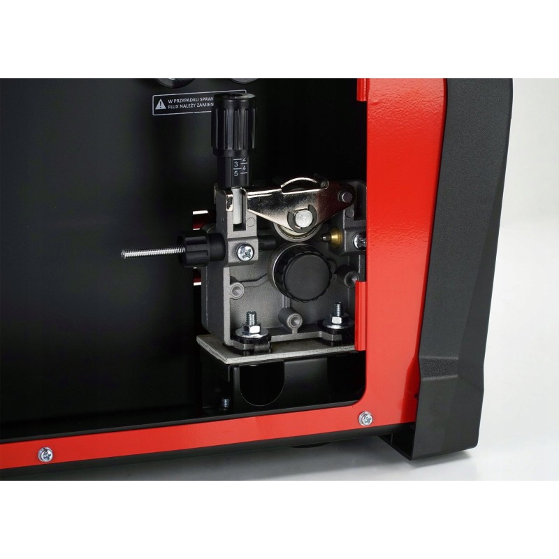 Das benutzerfreundliche Bedienfeld ermöglicht eine präzise und stufenlose Einstellung der Parameter. Das digitale Display zeigt den tatsächlichen Strom während des Schweißvorgangs an. Das halbautomatische Schweißgerät verfügt außerdem über ein Menü, das die Bedienung erleichtert und die Auswahl der zu schweißenden Materialart ermöglicht.