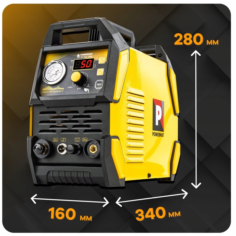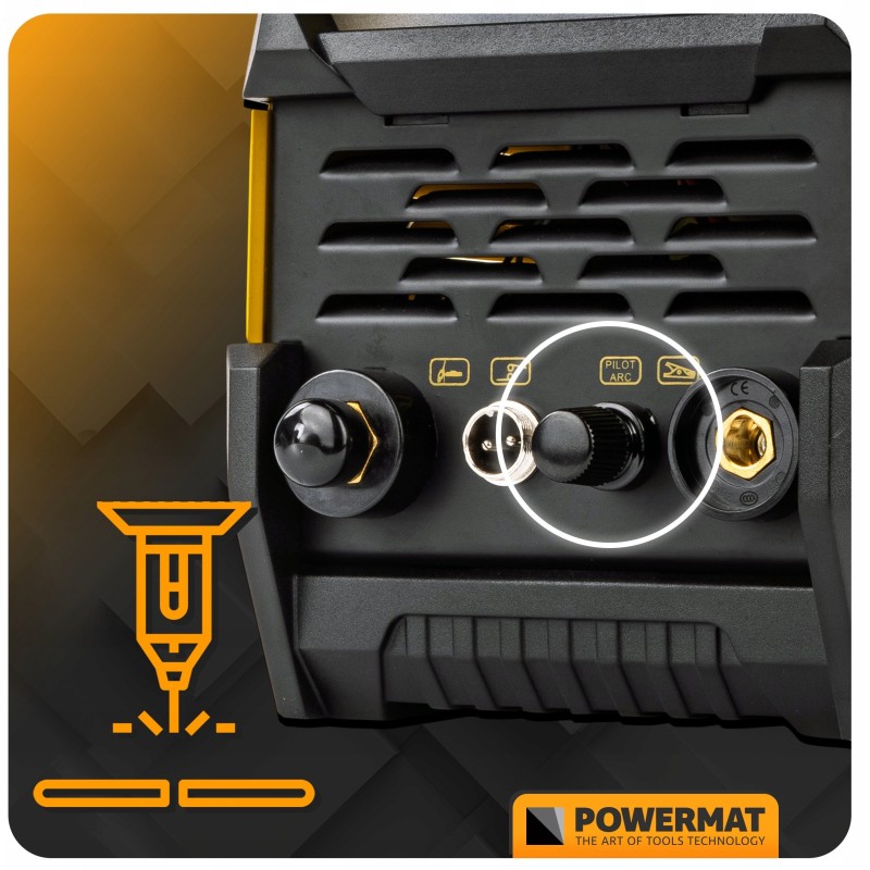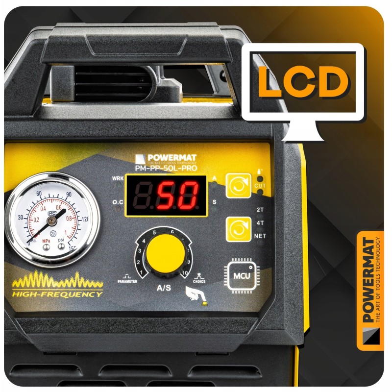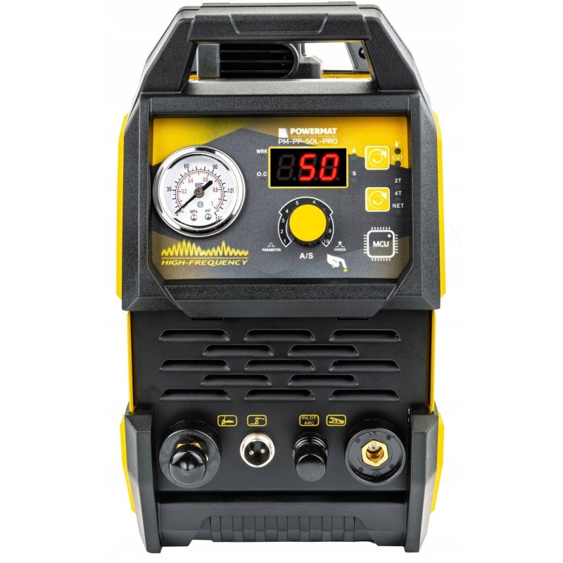 Die Plasmaschneidemaschine Powermat PM-PP-50L-PRO wurde für eine einfache und intuitive Bedienung entwickelt. Das digitale Display und das Manometer ermöglichen eine schnelle und bequeme Überwachung der Betriebsparameter, was den Bedienkomfort erhöht.