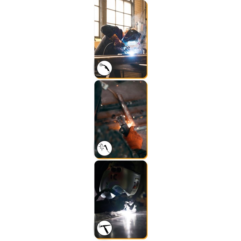 Dank seiner Vielseitigkeit unterstützt das Schweißgerät verschiedene Schweißverfahren, was die Bearbeitung zahlreicher Werkstoffe ermöglicht. Funktionen wie HOT START, ANTI STICK und ARC FORCE erhöhen den Komfort und die Effizienz beim Schweißen, erleichtern den Arbeitsbeginn und verhindern das Anhaften der Elektrode am Werkstoff.