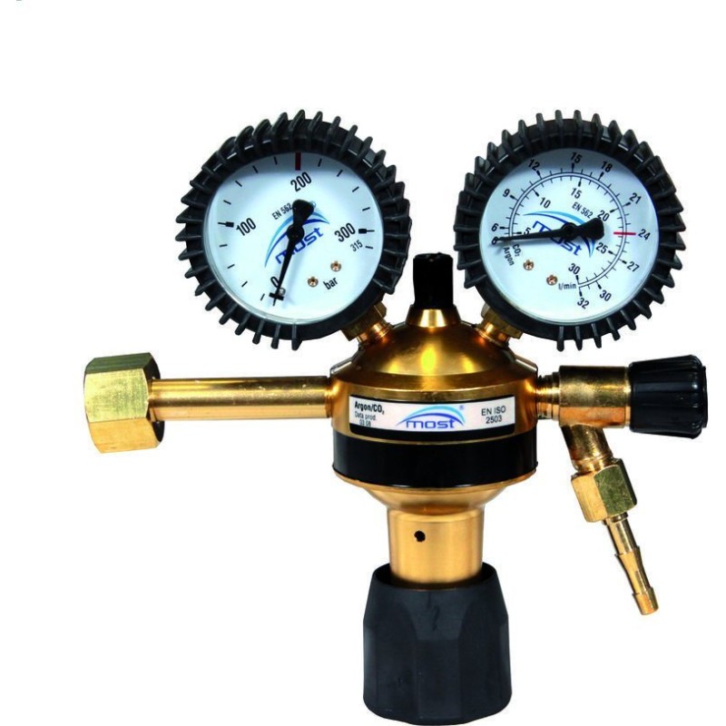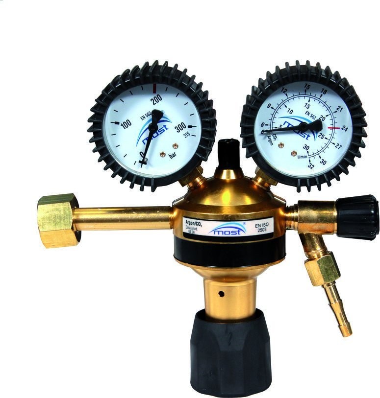 MOST-Druckminderer sind für einen Eingangsdruck von 200 bar ausgelegt und halten den Ausgangsdruck auf einem vom Benutzer festgelegten konstanten Niveau. Das hinter den Manometern an der Rückseite des Druckminderers angeordnete Sicherheitsventil erhöht die Arbeitssicherheit erheblich. Technische Daten: Gasart Ar/CO2. Max. Eingangsdruck 200 bar. Betriebsdruckbereich 0,5–6 bar. Max. Durchfluss 0–32 l/min. Gewinde der Einlassmutter – W 21,8x1/14"". Gewinde des Auslassstutzens G 1/4. Schlauchanschluss 6,3 mm. Merkmale – einstufig mit manometrischer Gasdurchflussanzeige.