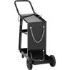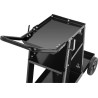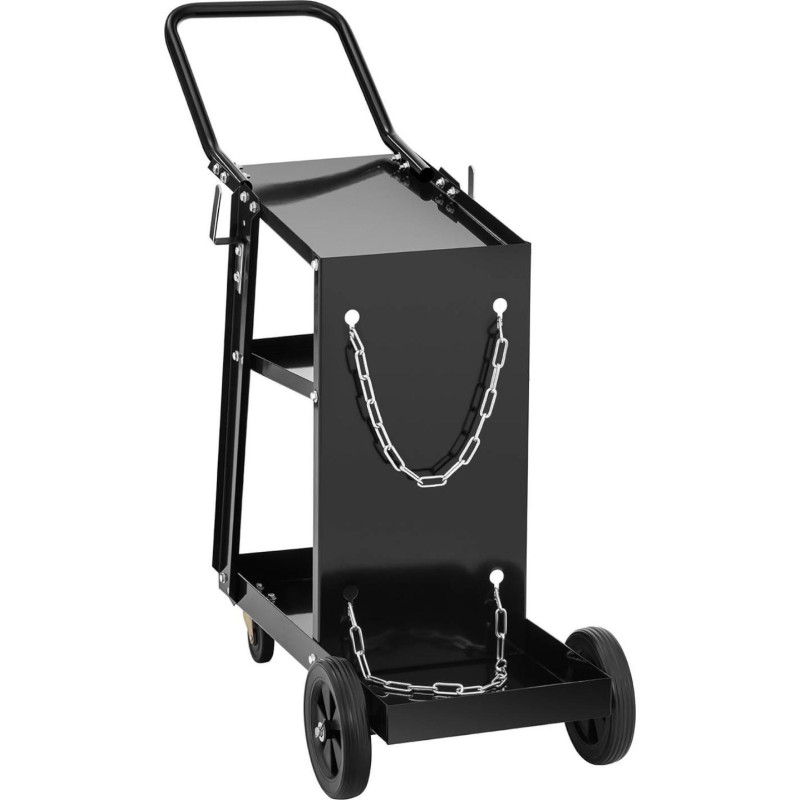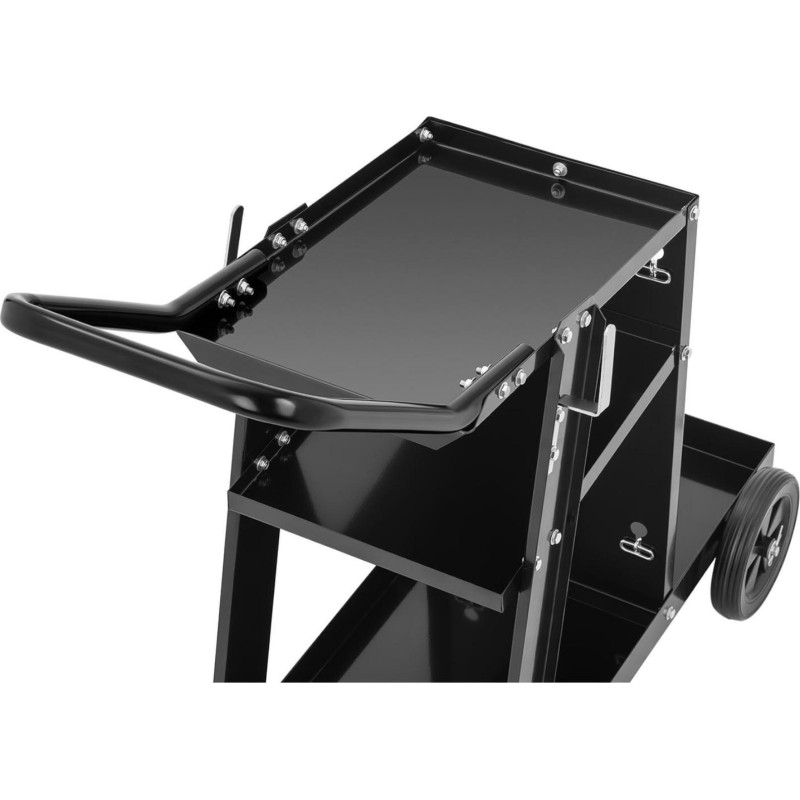 Der Schweißwagen eignet sich zur Aufbewahrung von Geräten und Werkzeugen in der Schweißbranche sowie zu deren bequemem Transport. Der Wagen verfügt über 3 Ablagen und hat eine maximale Tragkraft von 80 kg . Er verfügt außerdem über eine spezielle Ablage für eine Gasflasche sowie zwei Metallketten , um diese in der richtigen Position zu halten. Auf beiden Seiten befinden sich Halterungen für Kabel. 4 Rollen sorgen für die Mobilität des Wagens. Das hintere Rollenpaar mit einem Durchmesser von 190 mm stützt die Konstruktion des Wagens, die vorderen Rollen sind kleiner und schwenkbar (360 Grad). Ein komfortabler Griff sorgt für gute Manövrierbarkeit. Die Konstruktion des Wagens besteht aus widerstandsfähigem, schwarz lackiertem Stahl .