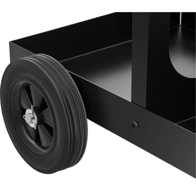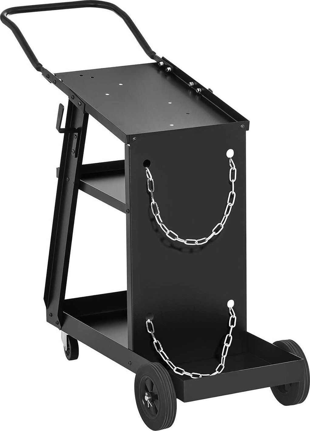 Der Stahl-Schweißwagen SWG-WC-2 ist dank seiner Konstruktion stabil und für Belastungen bis zu 75 kg ausgelegt. Dies ermöglicht den Transport schwerer Schweißgeräte, und auf der hinteren Ablage kann eine Gasflasche untergebracht werden. Zwei Ketten gewährleisten die Stabilität der Gasflasche.