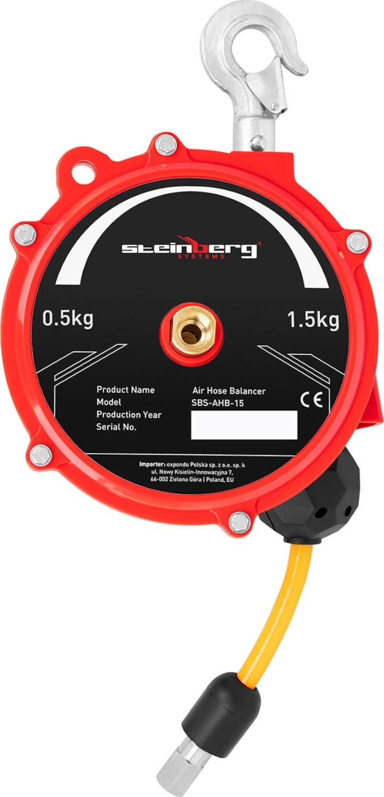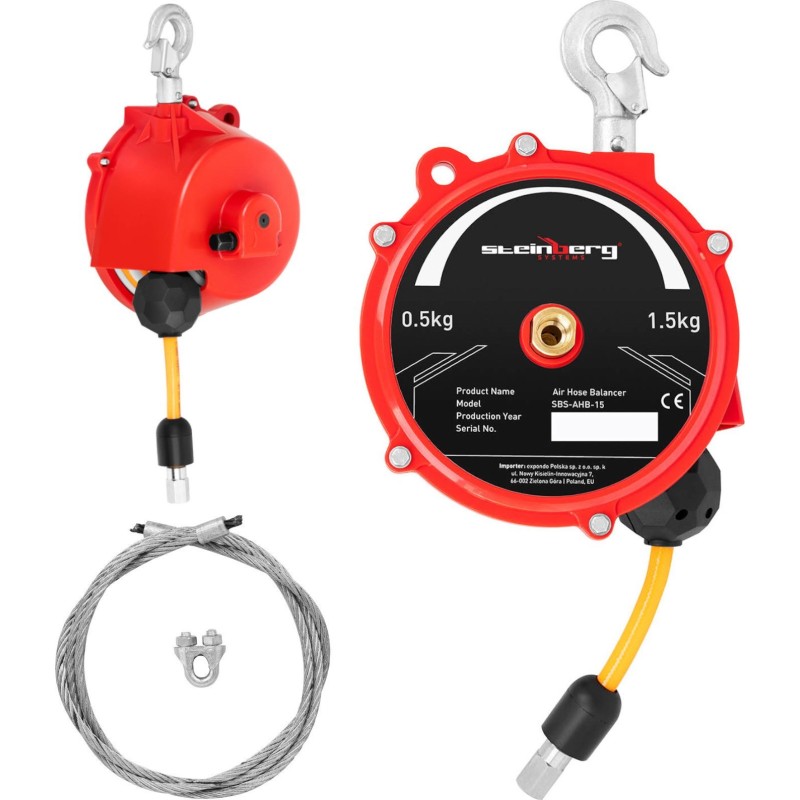 Der Balancer der Marke Steinberg Systems ermöglicht es, schweres Arbeitsgerät in der Werkstatt, in der Serienfertigung oder in der Montagehalle zu halten. Das Gerät hält Druckluftwerkzeuge mit einem Gewicht von 0,5 bis 1,5 kg in ihrer Arbeitsposition, wodurch sich die Werkzeuge leichter, präziser und mühelos führen lassen. Das Gehäuse des Balancers besteht aus robustem und langlebigem Stahl, der selbst intensiver Beanspruchung standhält. Der Polyester-Schlauch hält das Druckluftwerkzeug während der Montage und anderer Arbeiten sicher in der Hand. Das Gerät wird mit Druckluft mit einem Betriebsdruck von 10 bar (max. Druck 60 bar) betrieben. Der Druckluft-Balancer verfügt über einen R3/8''-Anschluss und einen R1/4''-Schlauchanschluss. Der Balancer muss immer senkrecht betrieben werden, um das Gewicht optimal auszugleichen. Der Schlauch ist 1,3 m lang und gewährleistet Bewegungsfreiheit.