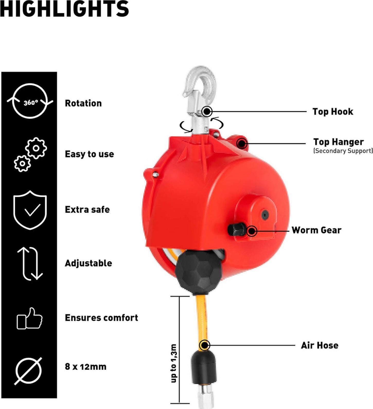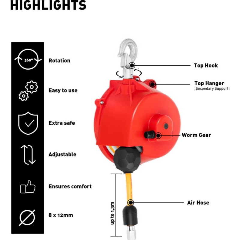• - Entlastet bei der Arbeit mit schweren Druckluftwerkzeugen und beugt Ermüdung vor,