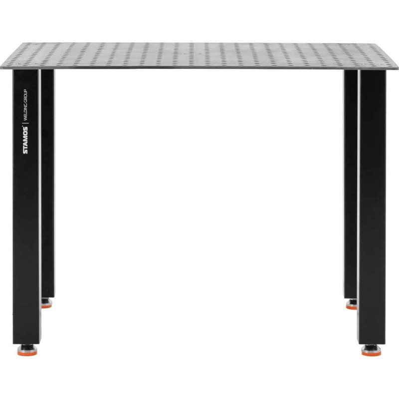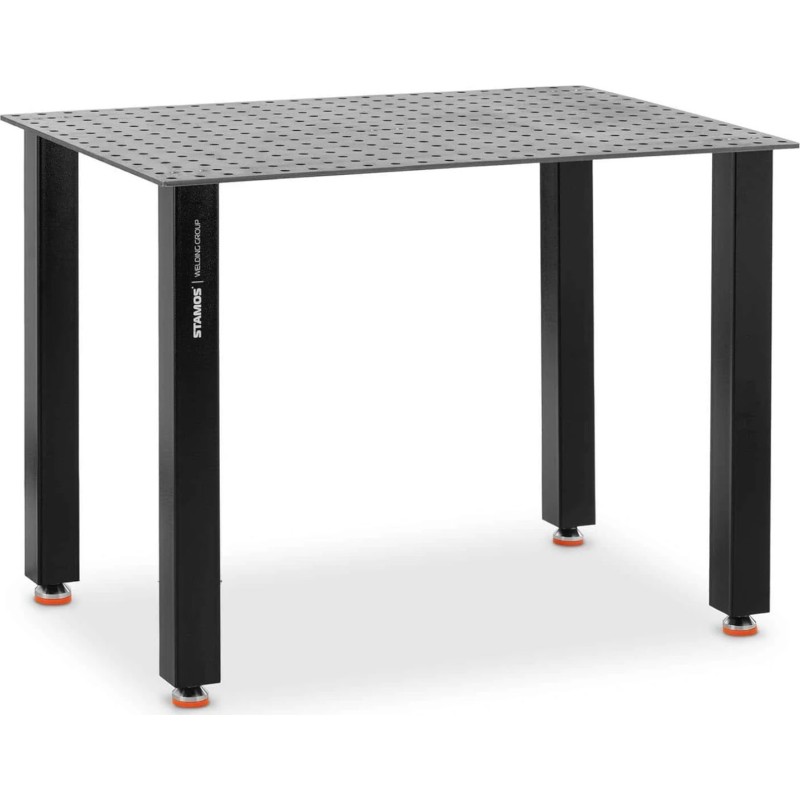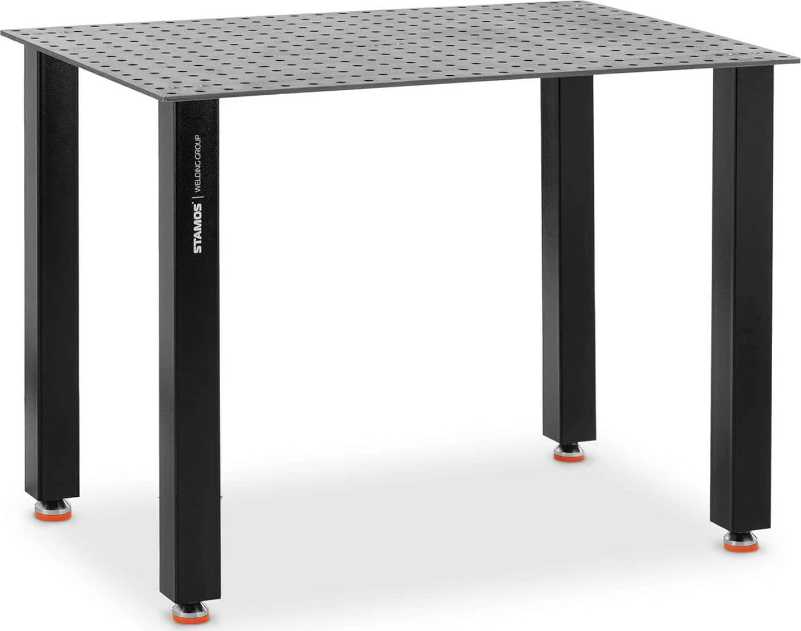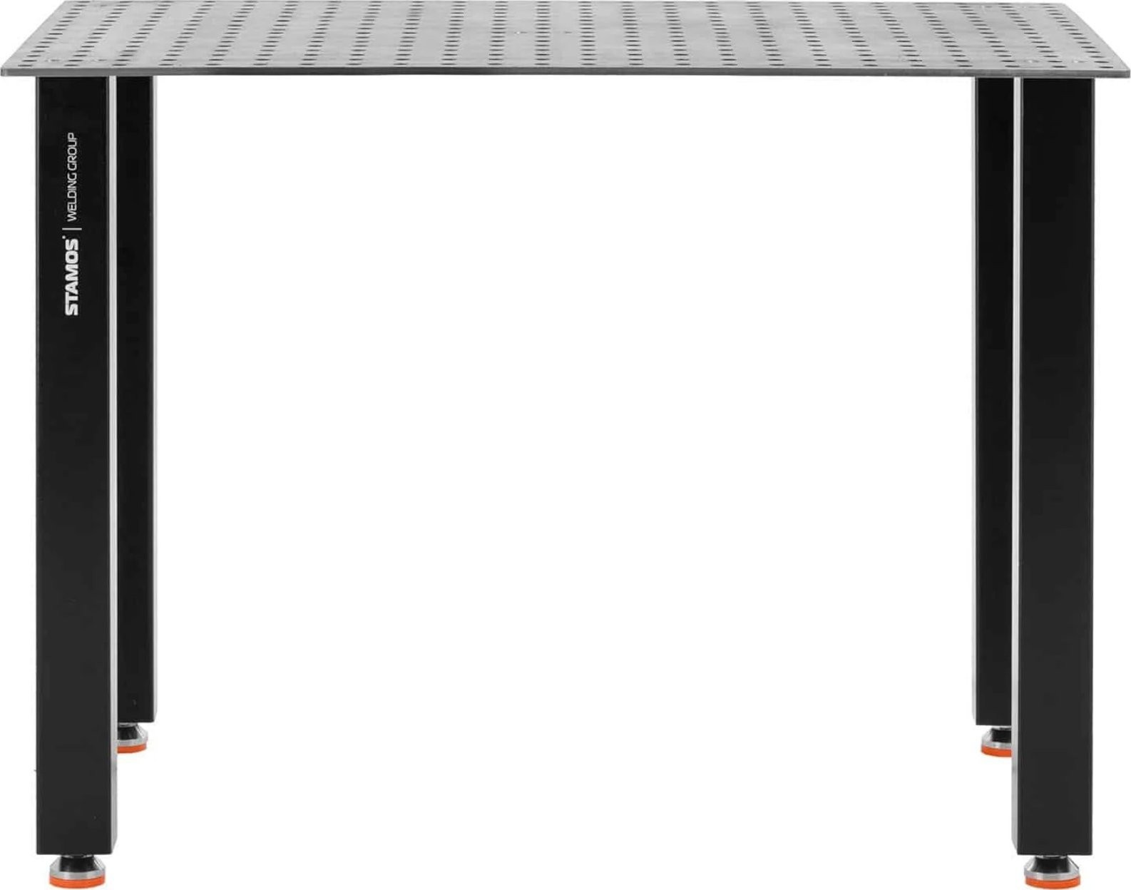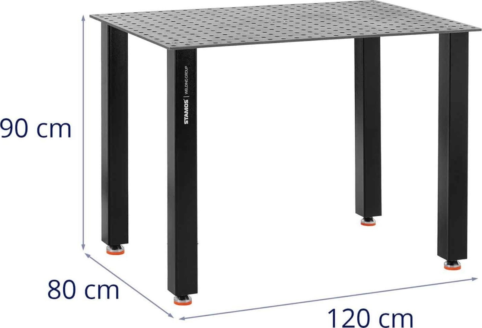 Der Schweißtisch der Marke STAMOS Germany besteht aus robustem Stahl (Q345C/Q235 ) und verfügt über eine Arbeitsplatte mit einer Fläche von 120 x 80 cm und einer Stärke von 10 mm , die selbst bei Schweißarbeiten mit voller Leistung weder wackelt noch vibriert. Die gelochte Stahlplatte ruht auf vier besonders stabilen Beinen mit den Maßen 80 x 80 x 885 mm . Zusätzliche Stabilität gewährleistet die Möglichkeit, die Höhe der Beine um bis zu 50 mm zu verstellen und Unebenheiten des Untergrunds auszugleichen. Die Öffnungen in der Arbeitsplatte dienen zur Befestigung und präzisen Ausrichtung der Werkstücke. Die stabile Konstruktion hält Werkstücke mit einem Gesamtgewicht von bis zu 150 kg.