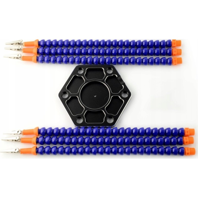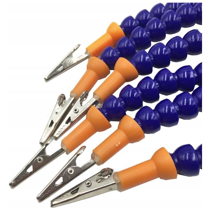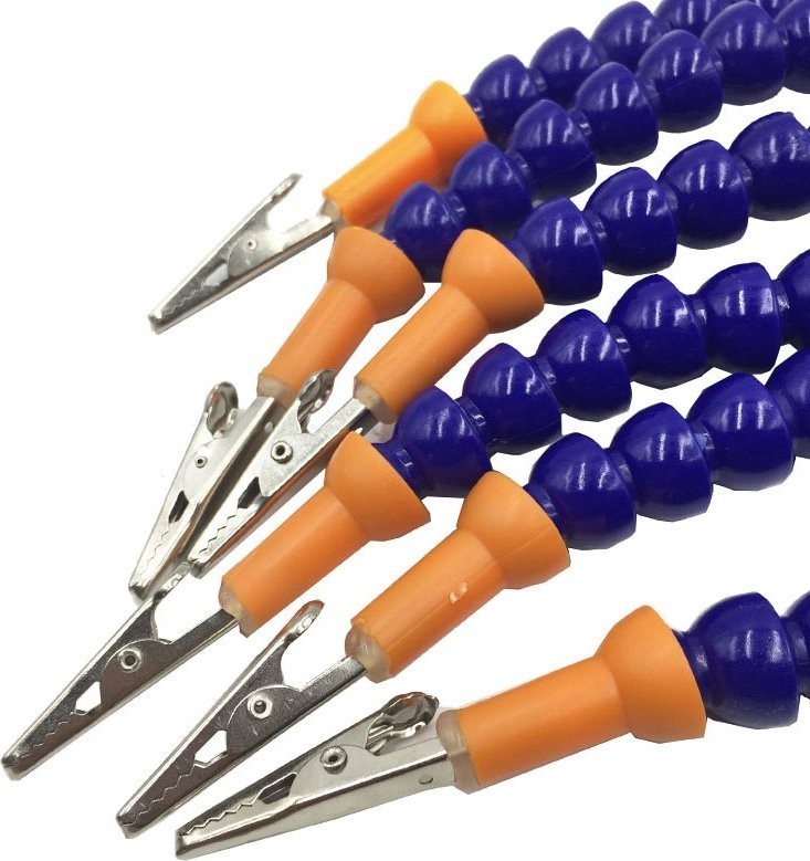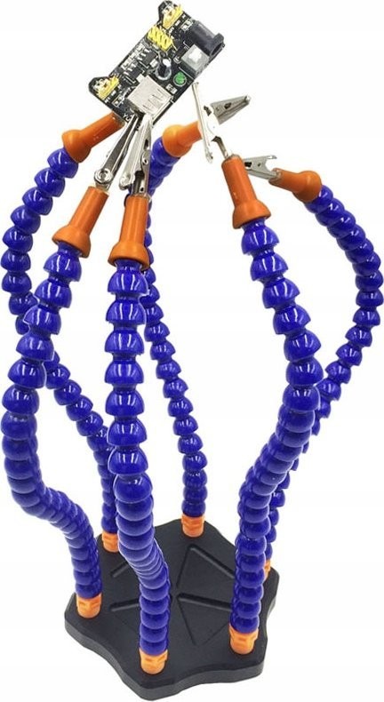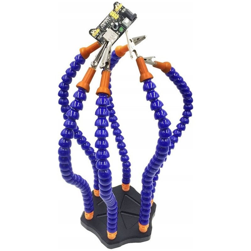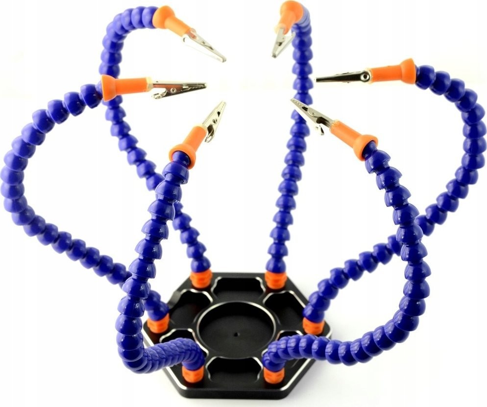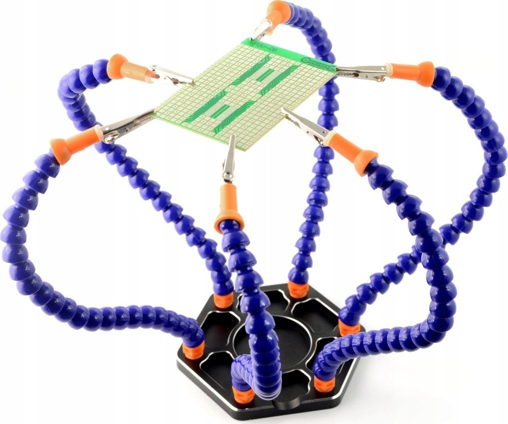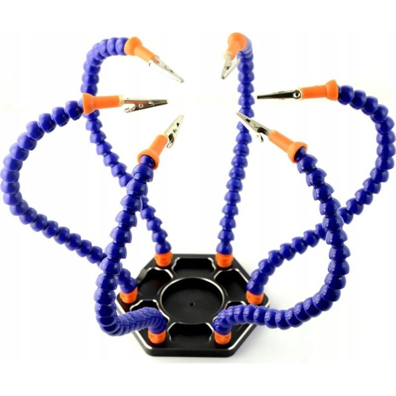 Sechsarmiger Halter mit Aluminiumfuß, bestimmt für Servicearbeiten, Elektroniker, Hobbybastler usw. Dank der 6 flexiblen Arme können wir praktisch jeden Gegenstand greifen, auch Leiterplatten mit den unterschiedlichsten Formen. Die Arme sind 32 cm lang und mit Krokodilklemmen versehen. Der Metallfuß aus einer Aluminiumlegierung sorgt für Stabilität. Er kann erfolgreich als Ersatz für Sets wie „Dritte Hand“, „Dritter Griff“ usw. verwendet werden.