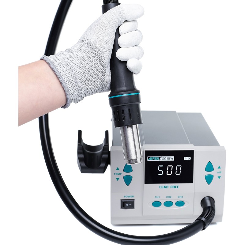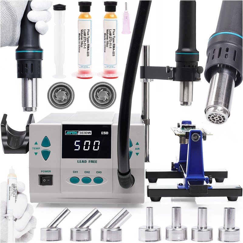 Die Lötstation AIFEN 861DW ist ein vielseitiges Werkzeug, das sicherlich auch die Erwartungen der anspruchsvollsten Anwender erfüllen wird. Im Lieferumfang sind verschiedene Düsen, ein Heißluftgriff sowie eine Halterung für Leiterplatten enthalten, was sie zur idealen Wahl für Profis macht.