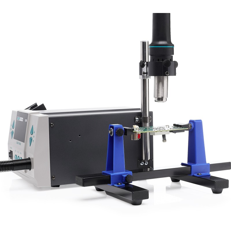 Die Sicherheit beim Arbeiten mit empfindlichen elektronischen Bauteilen gewährleistet die antistatische Ausführung (ESD Safe). Die Station ist mit einem großen, gut lesbaren LCD-Display ausgestattet, das die Kontrolle über Temperatur und Luftstrom erleichtert. Darüber hinaus erhöhen die Möglichkeit, gespeicherte Einstellungen mit einem Passwort zu schützen, sowie die Tastensperre den Schutz vor versehentlichen Änderungen der Einstellungen.