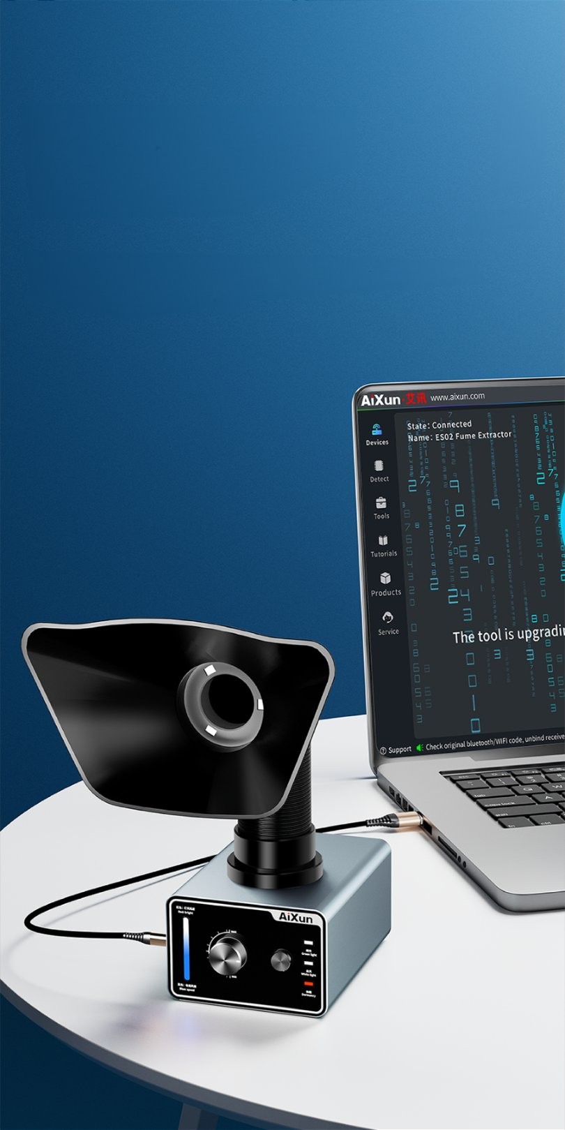 Der AiXun ES02-Absauger bietet intelligente Funktionen wie die automatische Aktivierung beim Anheben der Lötspitze, was die Effizienz und den Bedienkomfort erhöht. Darüber hinaus machen die Möglichkeit der Anbindung an das AiXun-Ökosystem sowie die Ein-Knopf-Steuerung die Bedienung des Geräts äußerst einfach und intuitiv.
