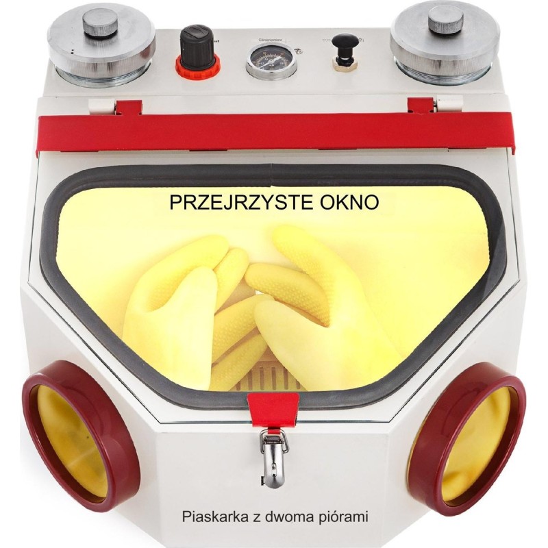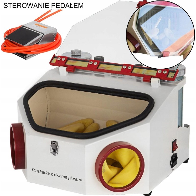 Der großzügige Arbeitsraum mit einem Durchmesser von 43 cm erleichtert die Bedienung erheblich. Zusätzlich ist die Sandstrahlmaschine mit einem Fußpedal ausgestattet, das eine einfachere Steuerung der Maschine ermöglicht.