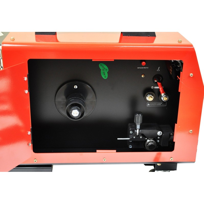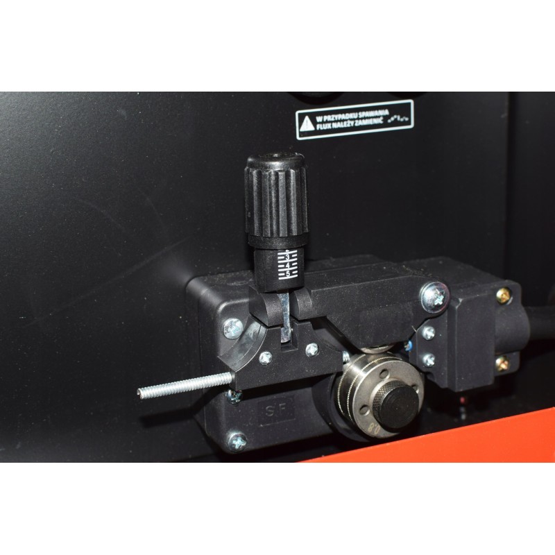 • Das halbautomatische Schweißgerät Super Mig 205 ermöglicht das Schweißen mit den Verfahren FLUX, MMA sowie MIG/MAG. Es eignet sich hervorragend zum Schweißen von Titan, Kupfer, Magnesium, rostfreiem Stahl, Kohlenstoffstahl, legiertem Stahl, Aluminium und Gusseisen. Der Drahtvorschub des Super Mig 205 bietet die Möglichkeit, eine Spule mit bis zu 5 kg zu verwenden. In der Nähe des Drahtvorschubs befinden sich Anschlüsse zum Wechseln der Polarität der Schweißzangen. Diese müssen vor Beginn des Schweißens ohne Schutzgas (FLUX) ausgetauscht werden.