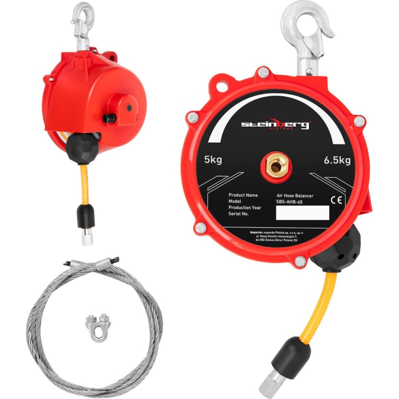 Der Balancer der Marke Steinberg Systems ermöglicht es, schweres Arbeitsgerät in der Werkstatt, in der Serienfertigung oder in der Montagehalle zu halten. Das Gerät hält Druckluftwerkzeuge mit einem Gewicht von 5–6,5 kg in ihrer Arbeitsposition, wodurch sich die Werkzeuge leichter, präziser und mühelos führen lassen. Das Gehäuse des Balancers besteht aus robustem und langlebigem Stahl , der auch intensiver Beanspruchung standhält. Der Polyester-Schlauch hält das Druckluftwerkzeug während der Montage und anderer Arbeiten sicher in der Hand. Das Gerät wird mit Druckluft mit einem Betriebsdruck von 10 bar (max. Druck 60 bar) betrieben. Der Druckluft-Balancer verfügt über einen R3/8'' -Anschluss und einen R1/4 ''-Schlauchanschluss . Der Balancer muss immer senkrecht betrieben werden, um das Gewicht optimal auszugleichen. Der Schlauch ist 1,3 m lang und gewährleistet Bewegungsfreiheit.