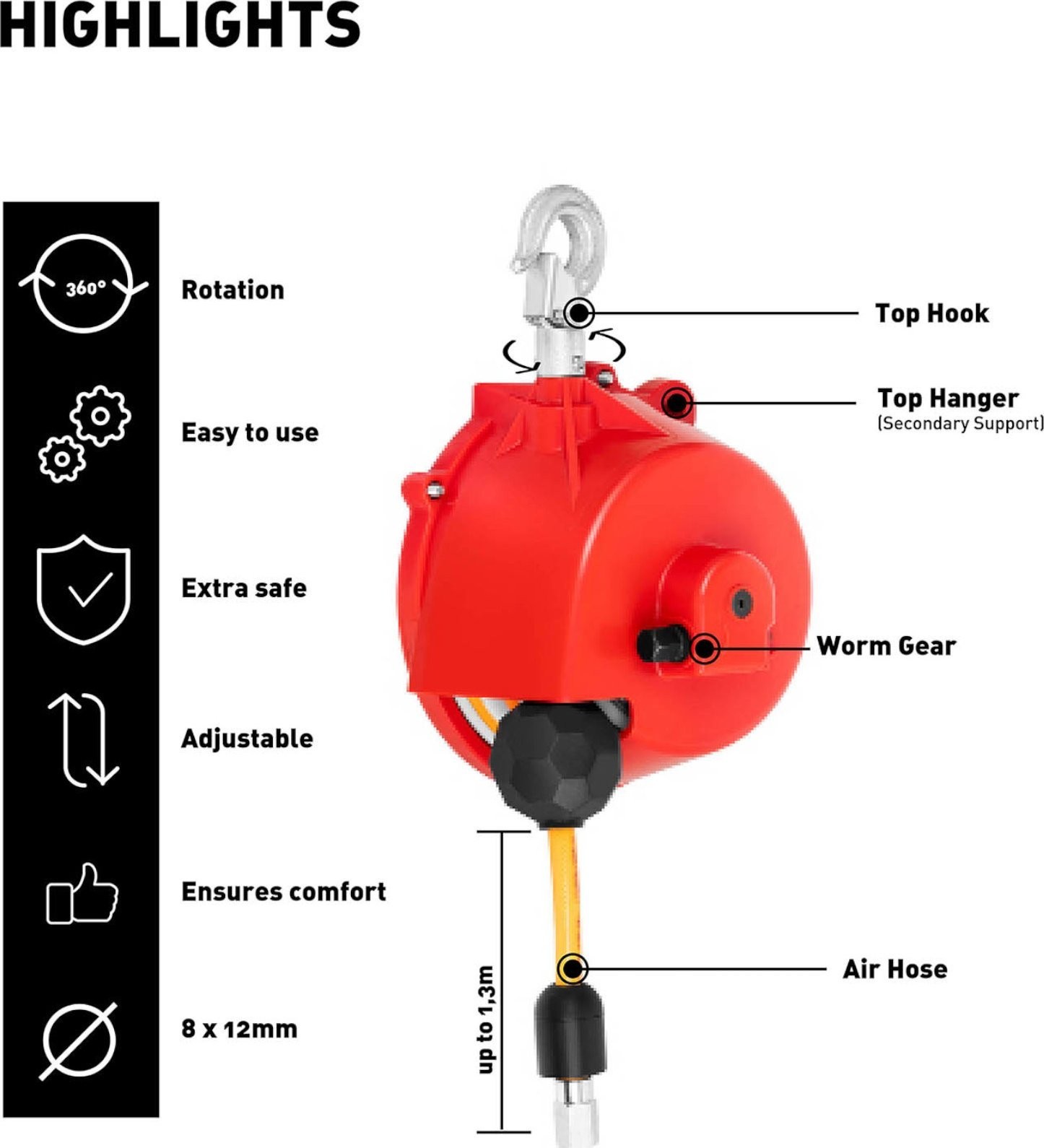 • - Entlastet bei der Arbeit mit schweren Druckluftwerkzeugen und beugt Ermüdungserscheinungen vor,