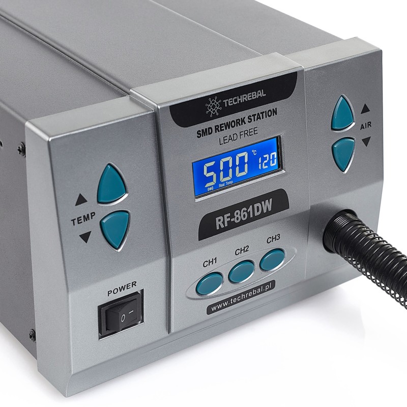 Dank einer leistungsstarken Turbine verfügt die Lötstation 861DW über eine Leistung von 1000 W, wodurch die erforderliche Temperatur schnell erreicht wird. Benutzer haben die Möglichkeit, die Temperatur im Bereich von 100 bis 500 °C einzustellen und die Luftstromstärke im Bereich von 1 bis 120 l/min zu regulieren, was eine hervorragende Kontrolle über den Lötprozess gewährleistet.