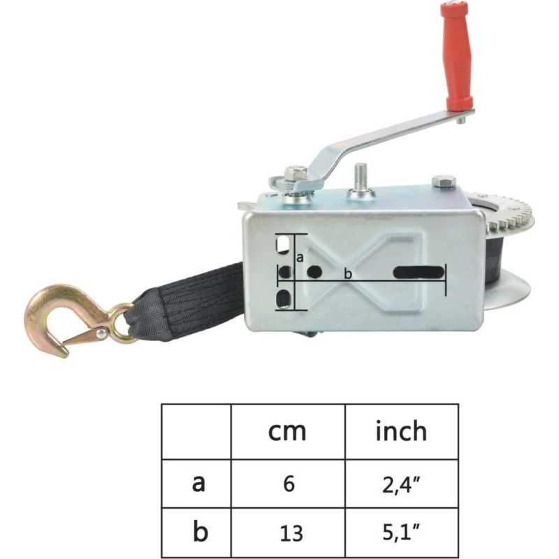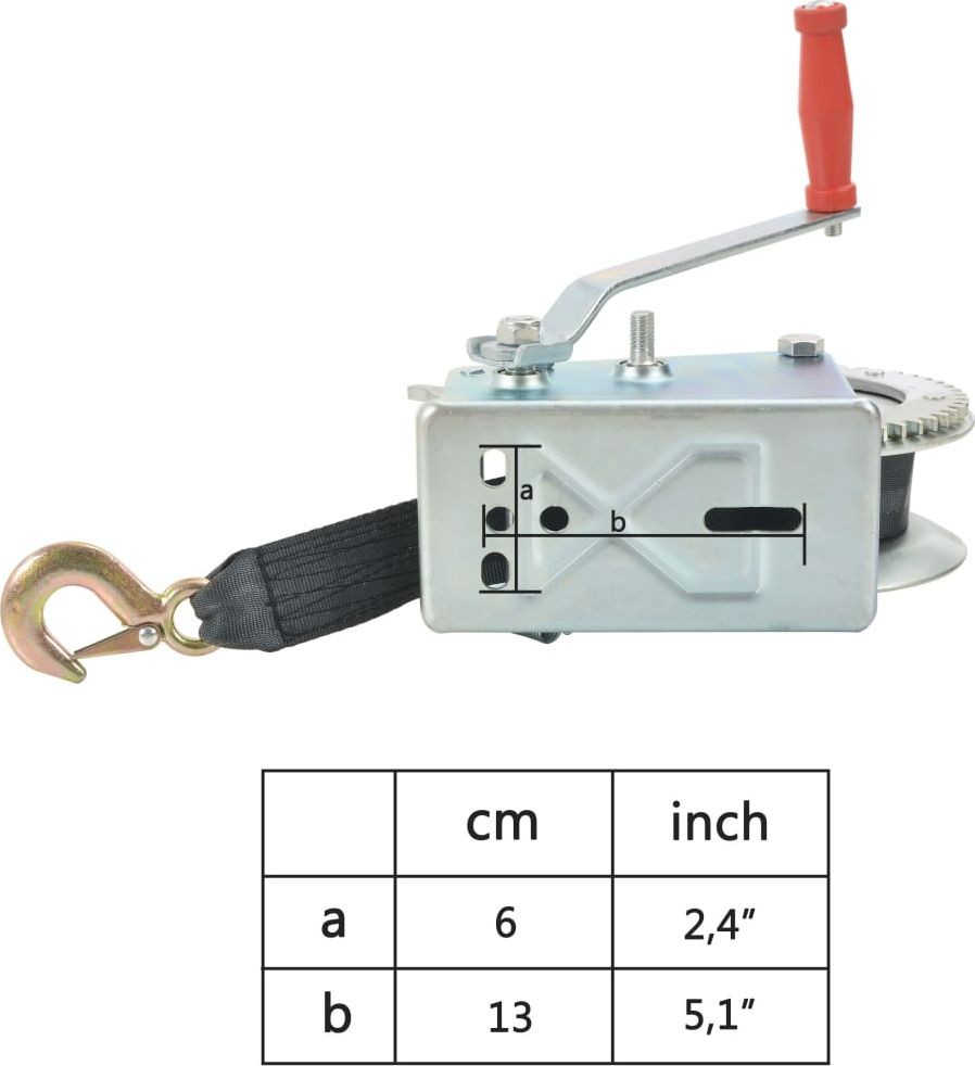 Diese Handwinde mit Gurtband eignet sich ideal zum Anheben von Fahrzeugen und Anhängern sowie für andere Anwendungen. In unserem Shop finden Sie einen passenden Halter zur Montage der Winde auf einem Boot (SKU 90634), mit dem Sie das gesamte Set vervollständigen können.
