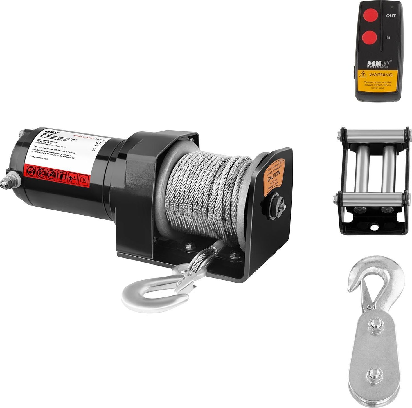 - Seilwinde - Steuerbox mit Kabeln - Befestigungsklammern für die Steuerbox – 2 Stück - Kabelfernbedienung - Funkfernbedienung - Montageplatte - 4-spurige Seilrollenführung - Seilrolle (4 t) – Haken – Montagezubehör – Bedienungsanleitung (PL)