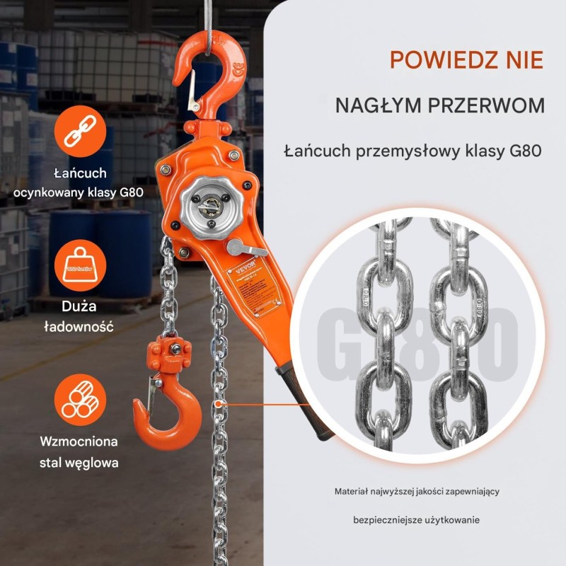 • G80-Kette, verzinkt und korrosionsbeständig, was die Lebensdauer des Produkts erhöht.