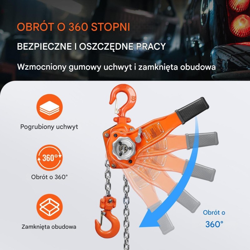 Die Winde ist mit einer zuverlässigen Bremse ausgestattet, die für Sicherheit während des Gebrauchs sorgt. Darüber hinaus ermöglicht der 360°-Haken ein einfaches Befestigen und Lösen von Lasten, was den Arbeitskomfort erhöht.