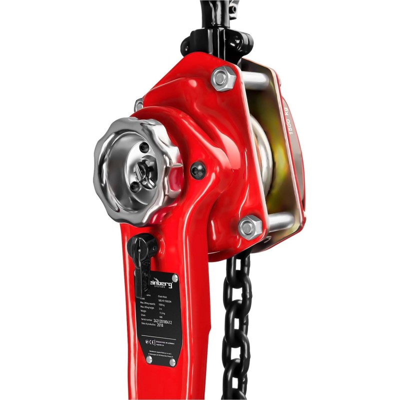 Herstellernummer: Steinberg Systems 10030378 Der Kettenzug der deutschen Marke Steinberg Systems ist ein vielseitiges Gerät, das sich hervorragend für verschiedene Produktionsbetriebe, Maschinenbauwerkstätten, Lagerhallen oder Baustellen eignet. Sein Hauptanwendungsbereich ist das Heben und Senken schwerer Gegenstände. Mit dem manuellen Kettenzug können Gegenstände mit einem Gewicht von bis zu 1500 kg sogar auf eine Höhe von zwei Metern angehoben werden. Dank der robusten Ketten (Typ G80, Glieder mit 8 mm Durchmesser) und der Fertigung der Bauteile aus hochwertigem Stahl ist die Arbeit mit dem Modell SBS-FZ 1500/2M sehr sicher. Dazu tragen auch die gummierte Spitze der Steuerwelle und die Arretierung bei, mit der die Last auf der gewünschten Höhe gehalten werden kann. Um den Bedienkomfort zu erhöhen, ist der Hebezug mit zwei drehbaren Haken sowie einem Hebel mit leichtgängiger Übersetzung ausgestattet, der mit einem Mechanismus im Inneren des Gehäuses verbunden ist. Dies ermöglicht ein komfortables Anheben und Absenken des Lastguts. Produktmerkmale
