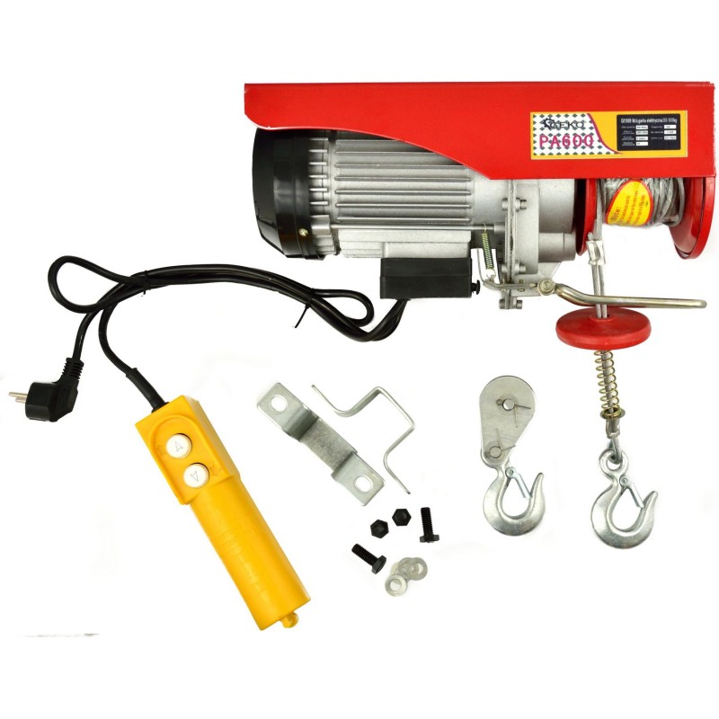 Professionelle elektrische Seilwinde mit einer Leistung von 1200 W und einer Tragkraft von bis zu 600 kg. Die Winde ist ein professionelles Gerät zum Heben schwerer Gegenstände in vertikaler Richtung. Sie wird häufig beim Hausbau und bei Renovierungsarbeiten sowie in Kfz-Werkstätten eingesetzt. Produktmerkmale Leistung: 1200 W Seillänge: 12 m Seildurchmesser: 4 mm Abmessungen der Basis: 147 x 385 mm Tragkraft an einem Haken: 300 kg Tragkraft an zwei Haken: 600 kg Hubgeschwindigkeit an einem Haken: 10 m/min Hubgeschwindigkeit an zwei Haken: 5 m/min Hubhöhe bei einem Haken: 12 m Hubhöhe bei zwei Haken: 6 m automatischer Sicherheitsschalter die Kupferwicklung des Windenmotors erhöht die Lebensdauer des Motors im Vergleich zu einer Aluminiumwicklung erheblich robustes Aluminiumgehäuse des Motors mit vergrößerten Kühlrippen, was eine effektivere Wärmeableitung ermöglicht vergrößerte Motorkühlturbine ergonomische Fernbedienung mit 140 cm langem Kabel CE-Zertifikat Lieferumfang elektrische Seilwinde 2 Befestigungshalterungen 4 Befestigungsschrauben mit Unterlegscheiben zusätzlicher Haken mit Seilrolle