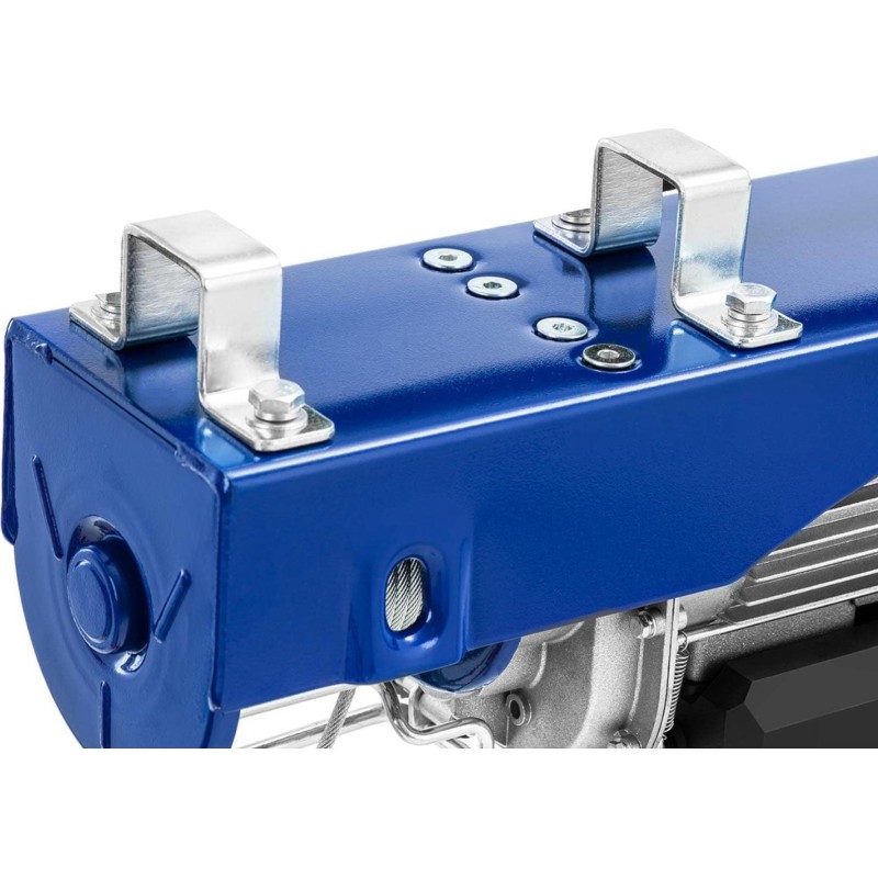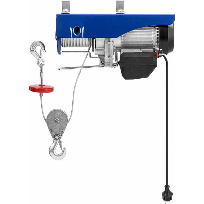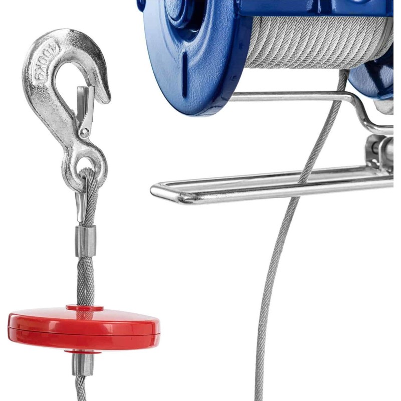 Der 230-V-Hebezeug verfügt über einen 1350-W-Motor, der das Heben schwerer Lasten mit einem Gewicht von 400 kg auf eine Höhe von bis zu 12 m ermöglicht. Mit dem elektrischen Hebezeug erledigen Sie Arbeiten in der Werkstatt und im Lager schnell und effizient. Die Hubgeschwindigkeit beträgt 8 m/min, was einen schnellen und effizienten Betrieb garantiert. Ein robustes, verdrehsicheres Stahlseil sorgt für Langlebigkeit und Zuverlässigkeit.