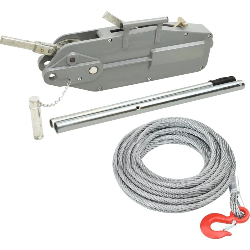 Das Gerät verfügt über ein Aluminiumgehäuse und einen Innenmechanismus aus Edelstahl. Das Seil ist mit einem Haken und einer Sicherheitsverriegelung ausgestattet, und der Hebemechanismus verfügt über eine Überlastsicherung, um ein hohes Maß an Sicherheit während des Betriebs zu gewährleisten. Die Seilwinde ist mit einem 20 m langen Stahlseil ausgestattet, das eine hohe Bruchfestigkeit und Verschleißfestigkeit aufweist. Sie ist mit einem Haken ausgestattet, der ein Herausrutschen verhindert. Der von einer Person mittels eines Teleskopgriffs bedienbare Hebezug ermöglicht das Arbeiten in jeder Position und auf jeder Höhe. Durch seine kompakte und leichte Bauweise eignet sich dieses Produkt für kleine oder beengte Räume.