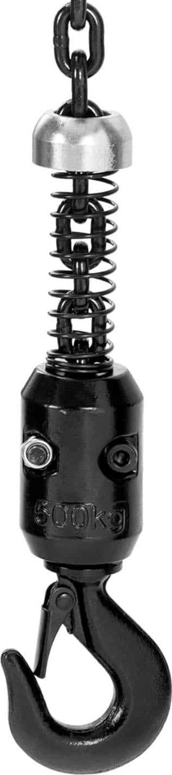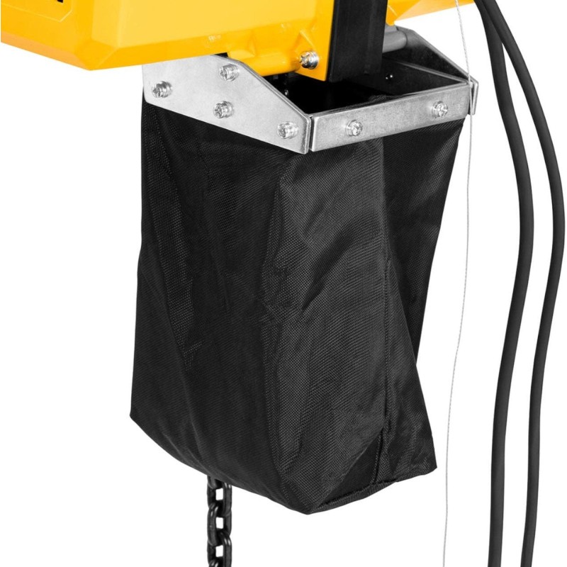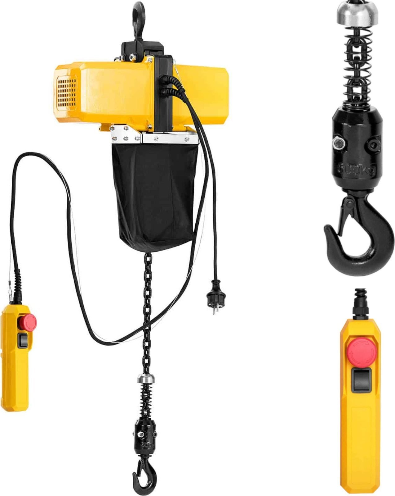 dem Kettenzug der Marke Steinberg Systems lassen sich Lasten mit einem Gewicht von bis zu 500 kg heben und senken. Die Hubhöhe von 3 m eignet sich für Lagerhallen, Garagen, Werkstätten, Arbeiten in der Höhe usw. Dank des robusten Hakens lässt sich das Gerät leicht befestigen. Der 680-W-Motor ermöglicht schnelles und müheloses Arbeiten. Die Hubgeschwindigkeit beträgt bis zu 3 m/min. Die Fernbedienung ist über ein langes Kabel mit dem Gerät verbunden, sodass Sie das Gerät aus sicherer Entfernung steuern können. Der Not-Aus-Schalter an der Fernbedienung stoppt das Gerät im Gefahrenfall. Der Lastbügel ist mit einer Sicherheitsverriegelung ausgestattet, die einen sicheren Transport der befestigten Last gewährleistet. Die Edelstahlkette mit einem Durchmesser von 6,3 mm ist robust und verschleißfest. Das Stahlgehäuse ist kratz-, splitter- und korrosionsbeständig. Der Hebezug verfügt über die Schutzart IP54 und ist gegen das Eindringen von Schmutz oder Wasser geschützt. Er verfügt außerdem über einen Überlastschutz.