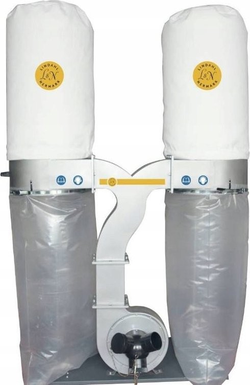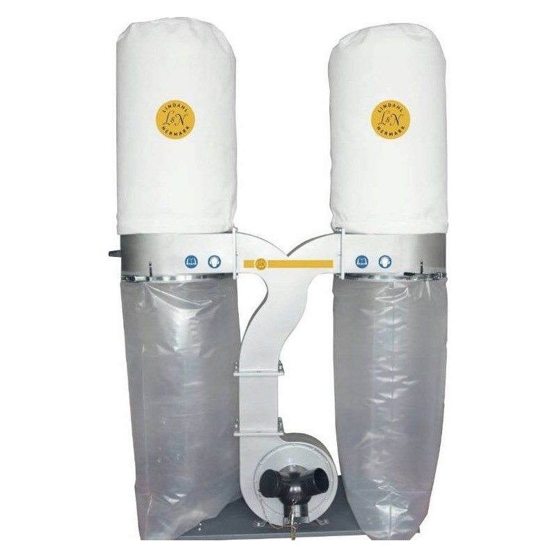 Staubabscheider mit zwei Auffangbeuteln. Geeignet für Holzbearbeitungsmaschinen mit einem Anschlussstutzen für die Absaugung von 125/100 mm und Hobelmaschinen mit einer Breite von bis zu 400 mm. Drei Ansaugöffnungen 100 mm oder eine Ansaugöffnung 150 mm. Der Staubabscheider lässt sich dank der mit Rollen ausgestatteten Grundplatte leicht bewegen. Der Staubabscheider ist mit Kunststoff-Auffangbeuteln sowie Textil-Filterbeuteln ausgestattet. Lieferung mit Rollgestell, Rohrverteiler 3x100 mm, Spannungsausfall-Schutzschalter – Schutzart IP54.