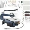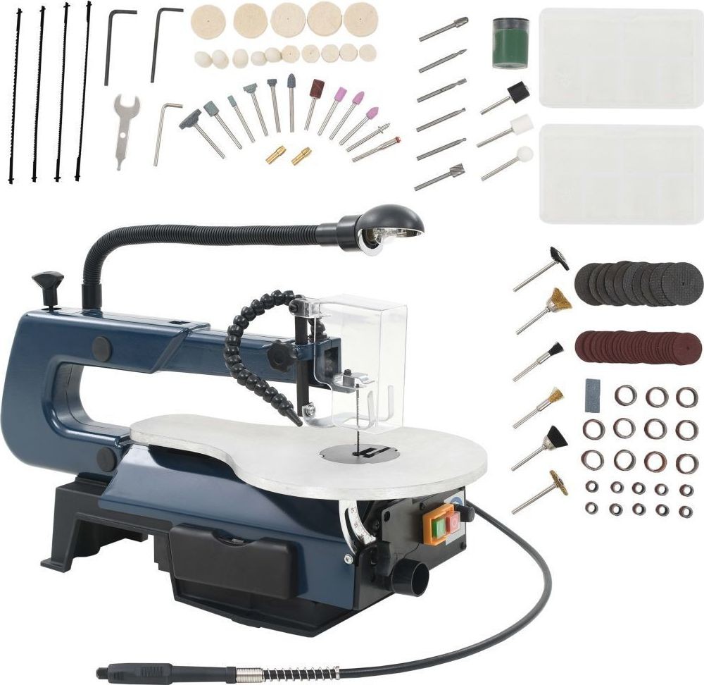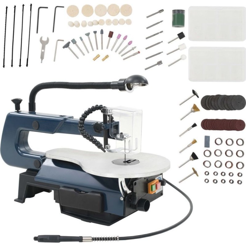 Die Drehzahl der Stichsäge ist von 550 bis 1600 Umdrehungen pro Minute einstellbar, während die Drehzahl der biegsamen Welle im Bereich von 1650 bis 4800 variiert werden kann, wodurch das Gerät leistungsstark ist und problemlos hartes Holz, Kunststoffe oder Metall schneiden kann. Der Arbeitstisch besteht aus robustem Aluminium und lässt sich für Genauigkeit und Präzision in einem Winkel von 0 bis 45° nach unten neigen. Die Säge wird mit 4 zusätzlichen Sägeblättern zum Schneiden verschiedener harter Materialien geliefert. Alle Kleinteile werden in einem praktischen Behälter aus Polypropylen geliefert, sodass sie gut organisiert aufbewahrt werden können.