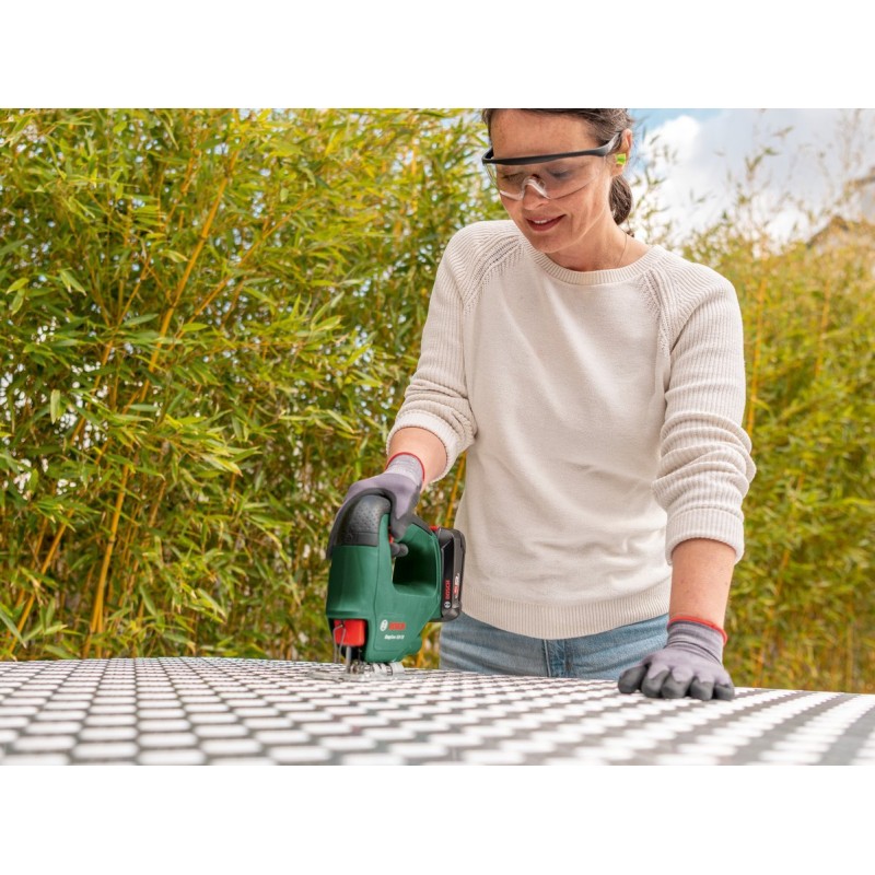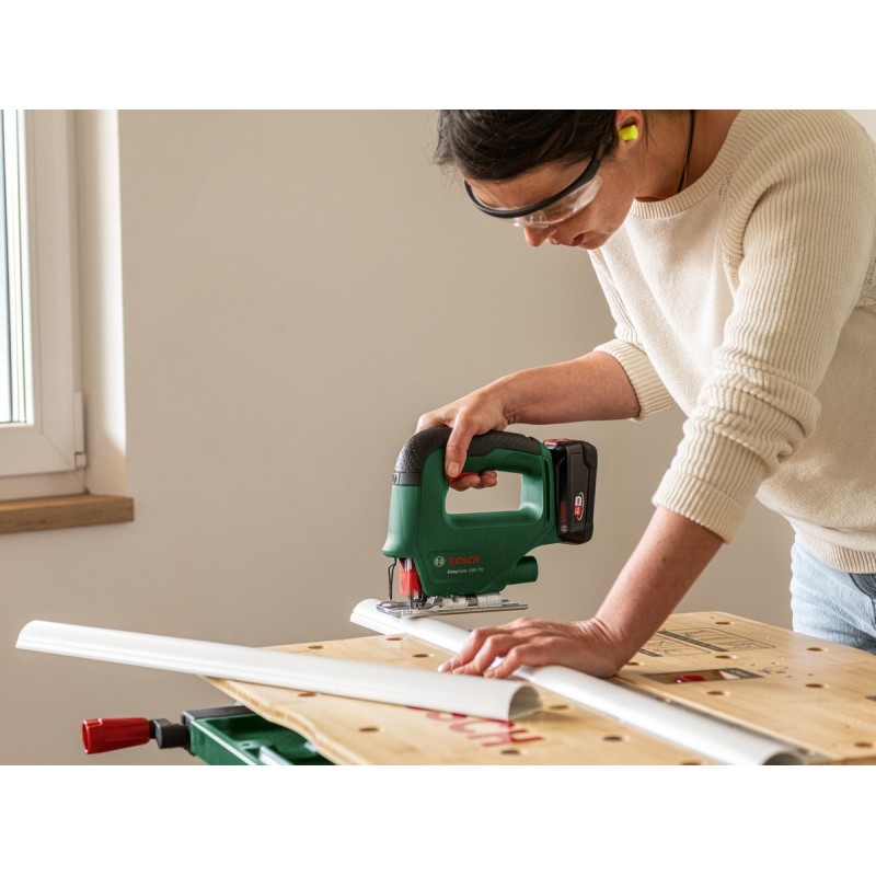 Das benutzerfreundliche, zuverlässige und kompakte Modell EasySaw 18V-70 ist die zuverlässige Wahl für kreative Projekte und Heimwerkerarbeiten. Diese leichte Stichsäge lässt sich mit nur einem Knopf bedienen und ermöglicht gerade und kurvige Schnitte mit einer Tiefe von bis zu 70 mm in Holzregalen oder Laminatplatten sowie mit einer Tiefe von bis zu 6 mm in Metall. Zusätzlichen Arbeitskomfort bietet der Drehzahlregler, der einen sanften Anlauf und eine stufenlose Drehzahländerung ermöglicht. Um die Genauigkeit der Schnitte zu erhöhen, bleibt die Schnittlinie dank der Abblasfunktion, die Staub entfernt, stets sichtbar. Das Sägeblatt lässt sich dank des integrierten SDS-Systems leicht austauschen. Das Werkzeug ist Teil der POWER FOR ALL ALLIANCE. Ein Akku kann zur Stromversorgung mehrerer Werkzeuge verschiedener Marken verwendet werden.