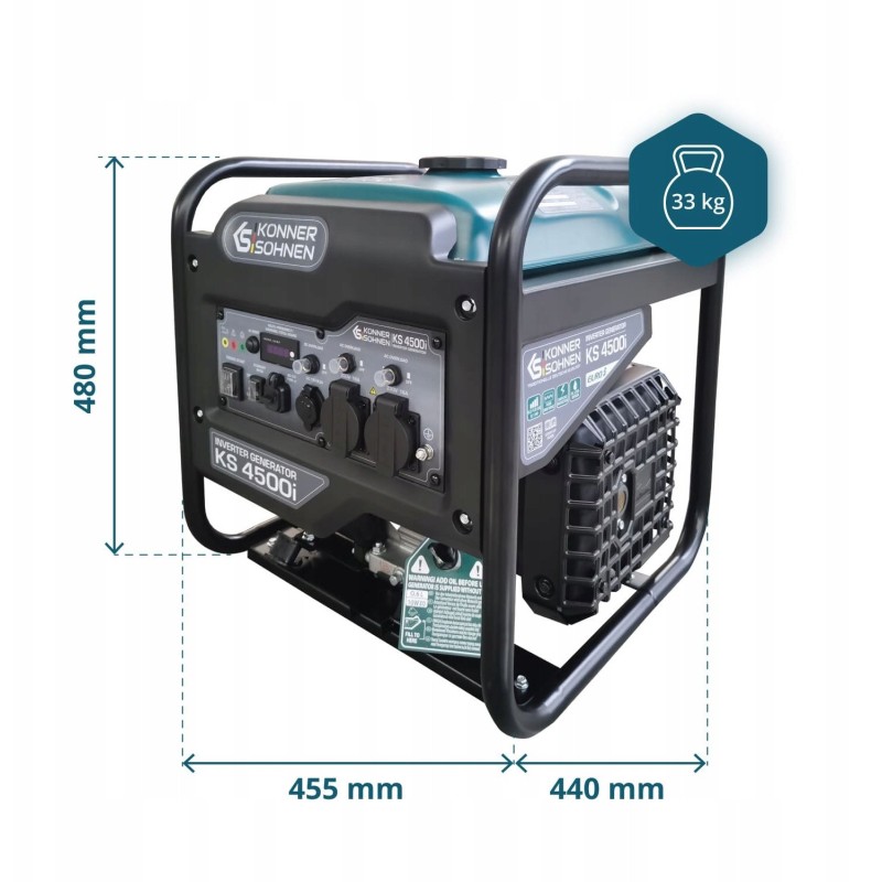 Der Generator KÖNNER & SÖHNEN KS 4500i zeichnet sich durch kompakte Abmessungen aus, was den Transport und die Lagerung erleichtert. Die Stützfüße sorgen für Stabilität während des Betriebs, was ihn zur idealen Lösung für Menschen macht, die viel unterwegs sind.