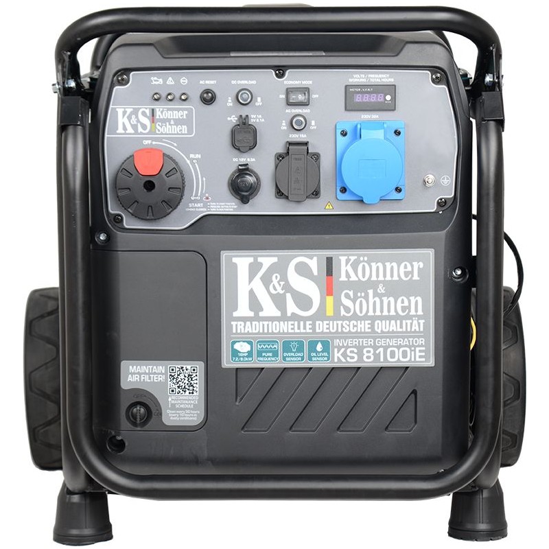 Der zuverlässige Motor von Könner & Söhnen erfüllt alle europäischen Qualitätsstandards, einschließlich der modernen Umweltnorm EURO V. Der zuverlässige Motor der Marke K&S verfügt über eine individuelle Seriennummer, die es uns ermöglicht, die Qualität der Produktion und des Betriebs zu kontrollieren. Ein hochwertiger Generator mit Kupferspule und ein leistungsstarker Antriebsmotor garantieren einen störungsfreien und langlebigen Betrieb. Der Einsatz von energieempfindlichen Geräten (Heizkessel, medizinische Geräte, Audiogeräte usw.) wird empfohlen.