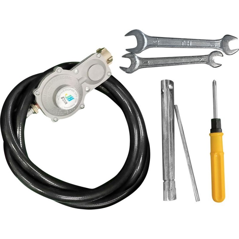 2. Ein Druckminderer am Schlauch erhöht die Zuverlässigkeit der Gasverbindung, senkt den Druck und verhindert eine Überlastung des Gasanschlusses. Sie müssen lediglich den Generator an die Gasflasche anschließen und den Motor starten.
