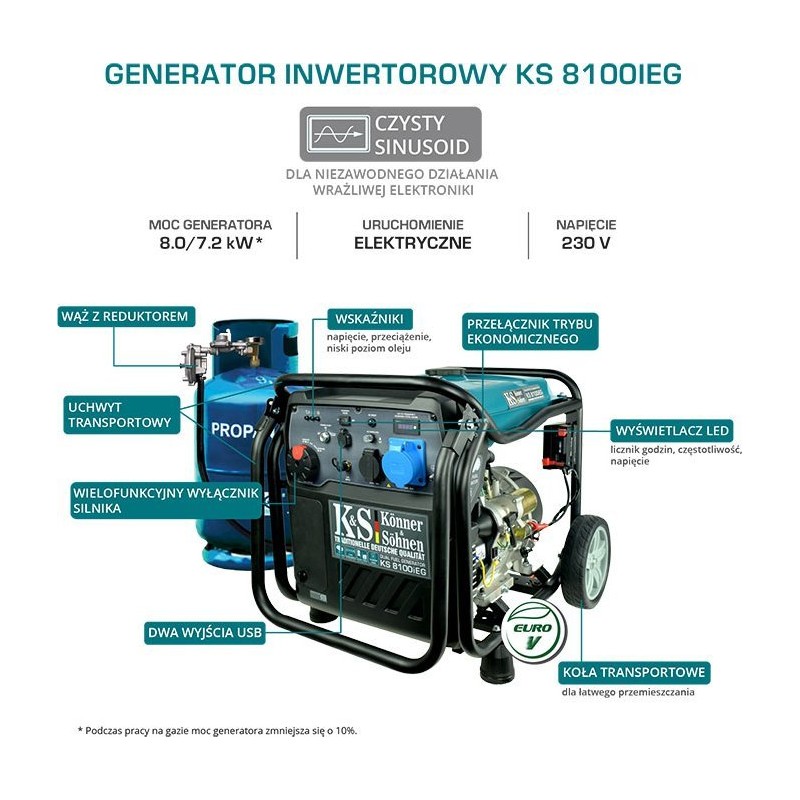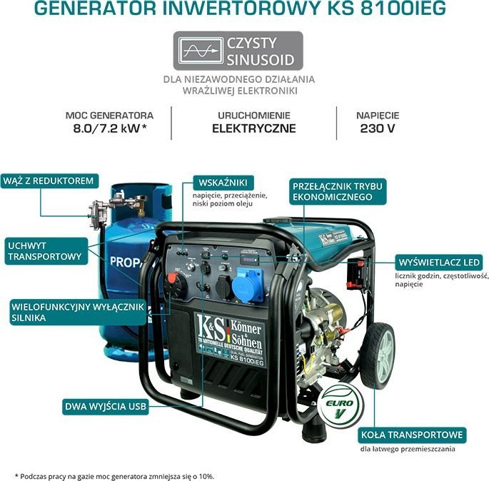 Anschlussmöglichkeit sowohl an eine tragbare Gasflasche als auch an einen stationären Gastank (Gasholder). Vorbehaltlich des Anschlusses durch einen zertifizierten Fachmann. Der Druck im Versorgungssystem darf 16 bar nicht überschreiten. Die Motoren der Inverter-Generator-Serie der Marke „Könner & Söhnen“ können im Sparmodus betrieben werden. Dieser Modus ermöglicht es, den Inverter-Generator bei niedriger Drehzahl zu betreiben und den Kraftstoffverbrauch um bis zu 50 % zu senken. Die Drosselklappensteuerung passt die Motordrehzahl je nach Last an.