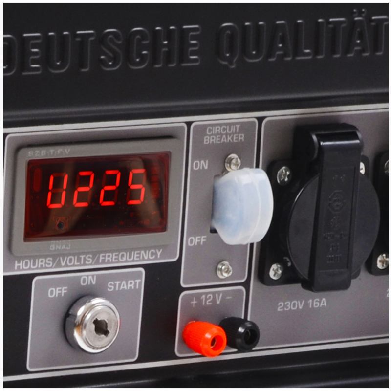 • Elektronisches Display mit Voltmeter, Frequenzanzeige, Betriebsstundenzähler