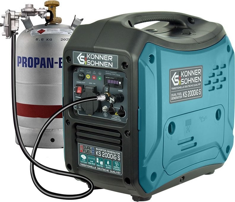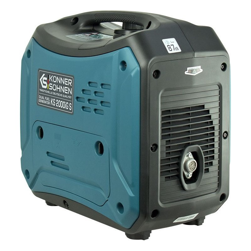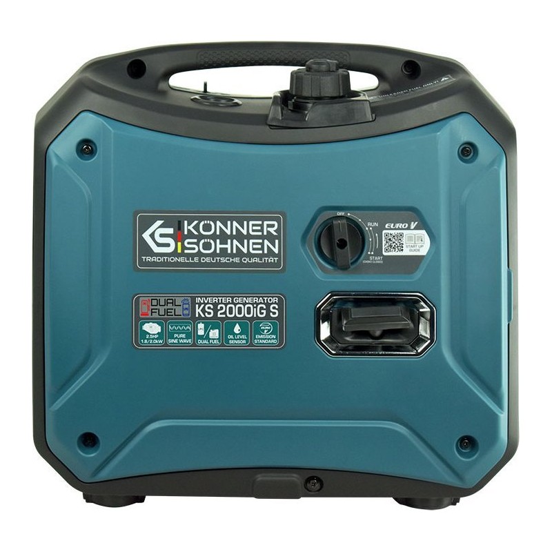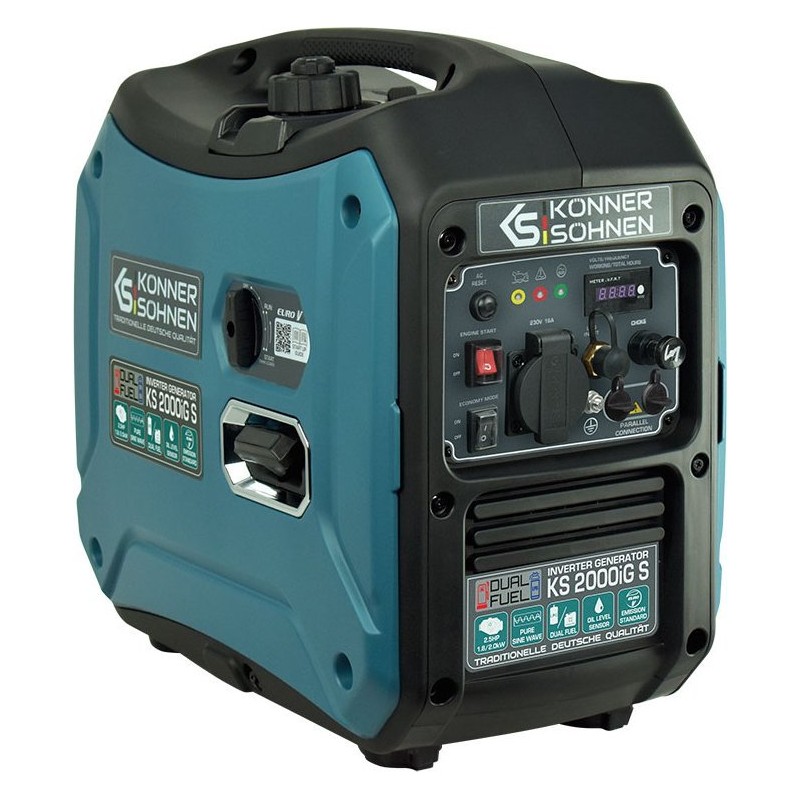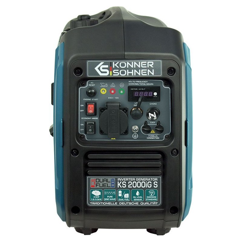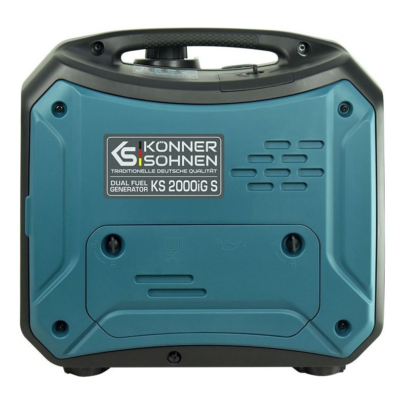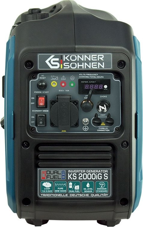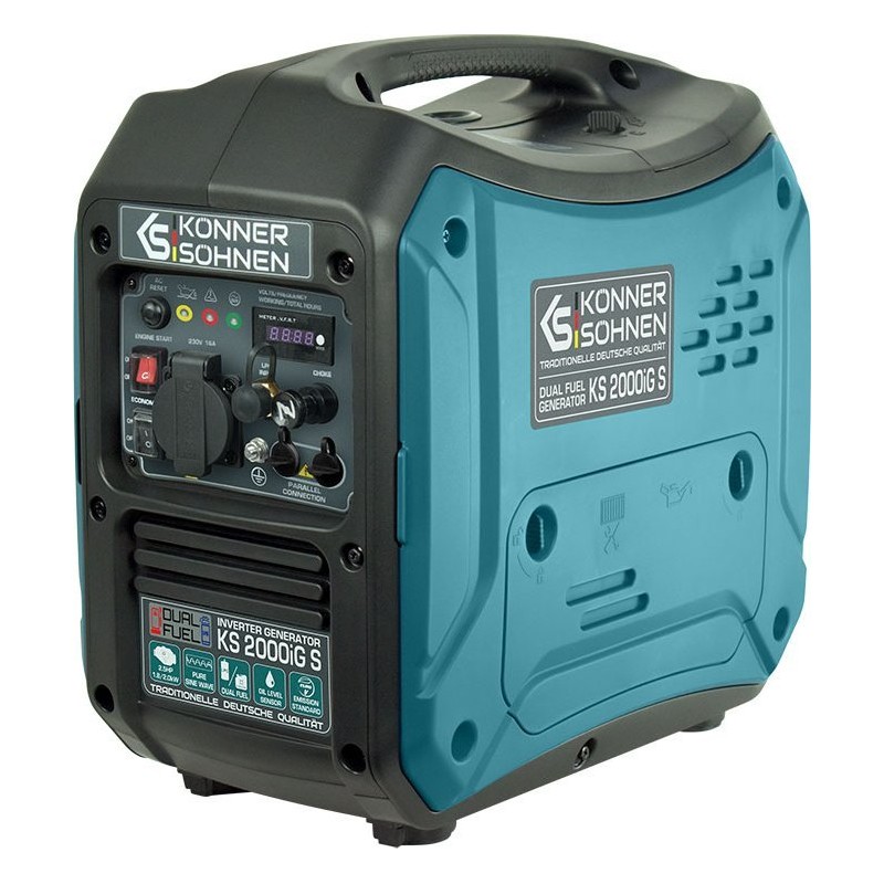 Der Inverter-Gas-Benzin-Generator Könner & Söhnen KS 2000iG S der deutschen Marke Könner & Söhnen ist eine komfortable, kompakte und nahezu geräuschlose Stromquelle. Das Hauptmerkmal dieses Modells ist, dass es Strom mit einer reinen Sinuswelle erzeugt.