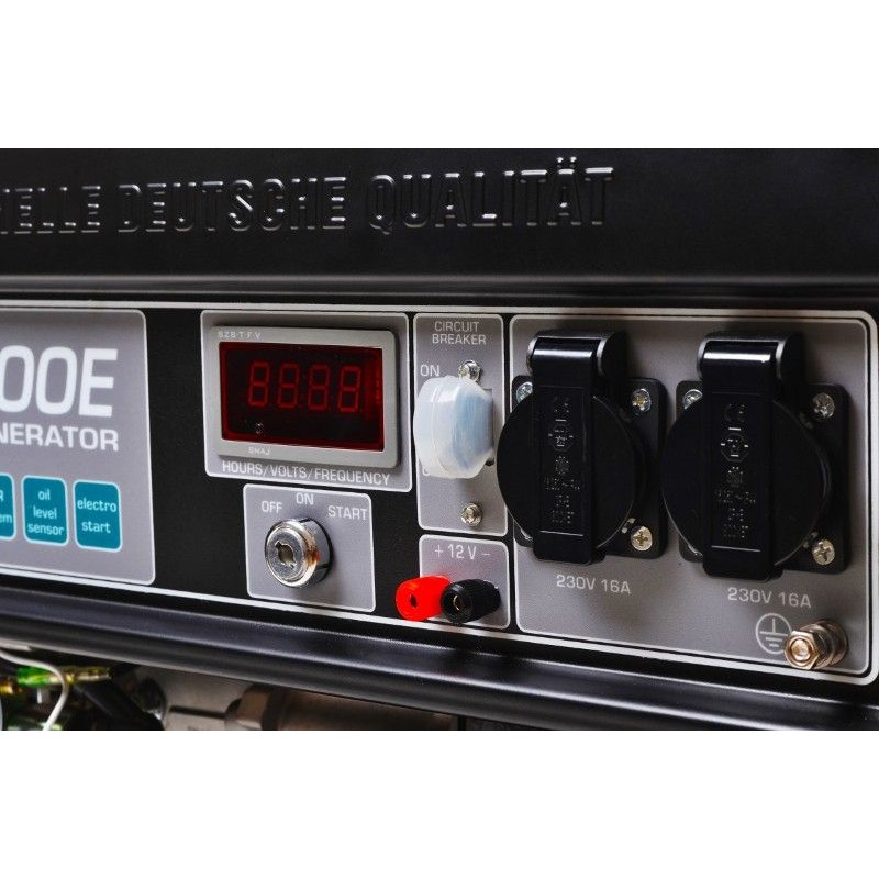 Das komfortable, ergonomische Bedienfeld mit Elektrostarter, der den Generator mühelos startet, ermöglicht eine einfache Steuerung des gesamten Geräts und erfordert keine besonderen Kenntnisse. Ein modernes, intelligentes LCD-Display zeigt stets die Betriebsstunden, die Frequenz und die Ausgangsspannung an. Die Informationen auf dem Display helfen dabei, die Belastung des Geräts richtig einzuschätzen und den Generator rechtzeitig zu warten, wodurch seine Lebensdauer verlängert wird.